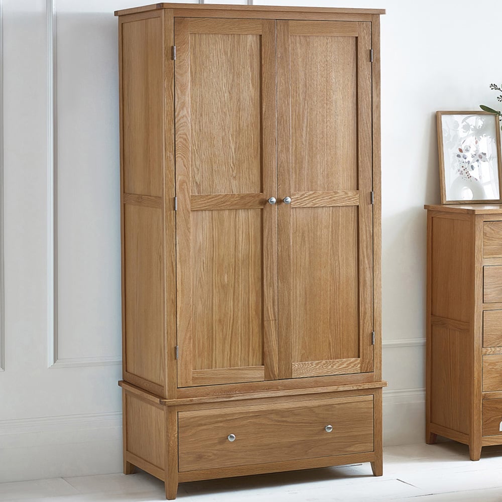 The Julian Bowen Mallory Combination Wardrobe is a true masterpiece, crafted with the finest quality solid oak and oak veneers to ensure style and durability. This wardrobe boasts a spacious double-door design, along with an additional drawer for all your clothing storage needs. The beautiful round silver knobs add a touch of elegance, making it a perfect fit for any modern or traditional bedroom space. This wardrobe is not only stylish but also built to last for years to come. With its impressive design and ample storage space, the Mallory Combination Wardrobe is a perfect addition to any home.