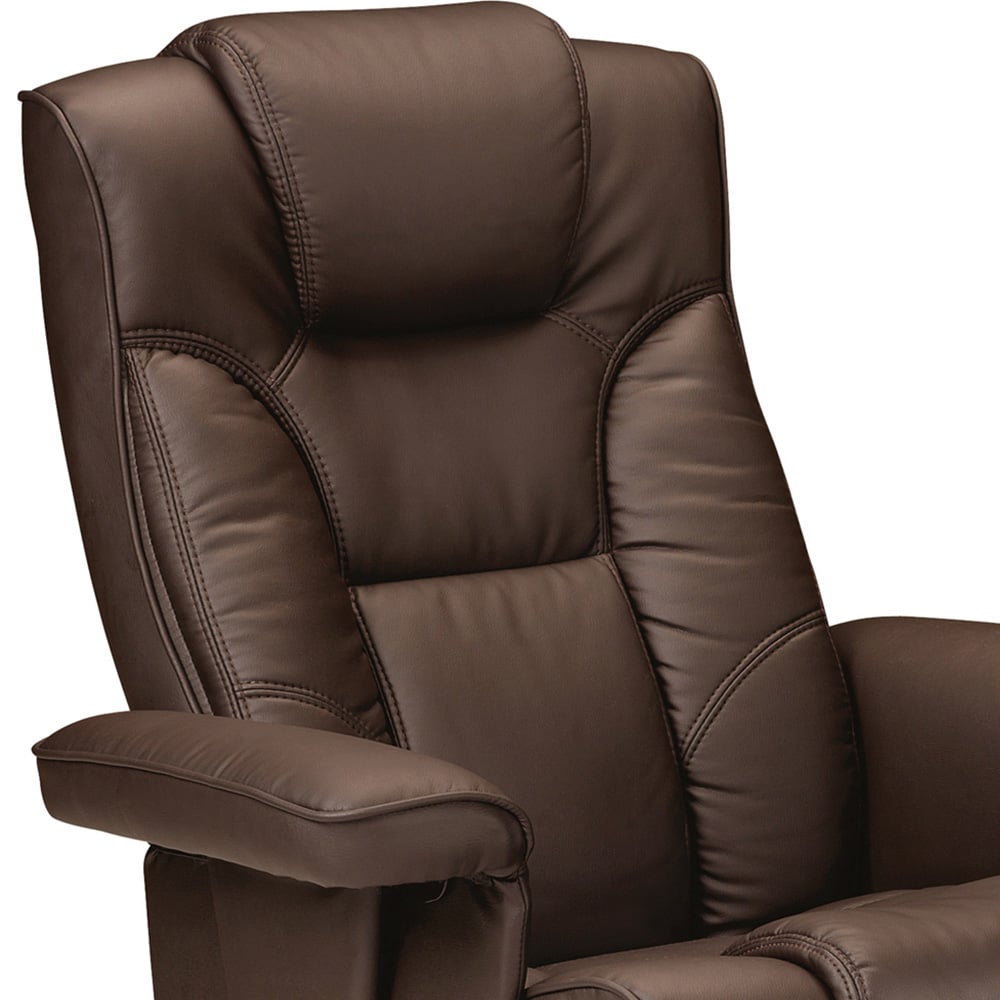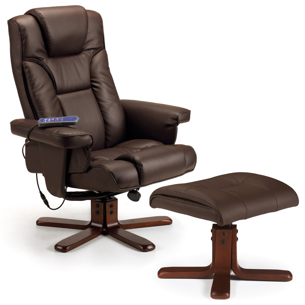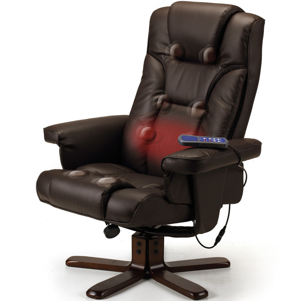 Experience ultimate comfort and relaxation with the Julian Bowen Malmo Brown Massage and Heat Recliner Chair with Footstool. This luxurious reclining swivel chair and stool are upholstered in a soft touch of faux leather, complemented by a walnut colour laminated base. With the addition of an eight-point massage unit and a lumbar heated pad, this chair takes relaxation to a whole new level.
