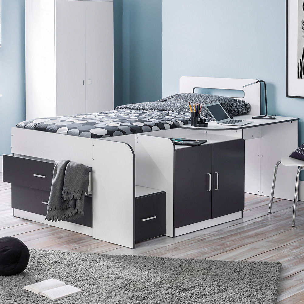 Elevate your children’s bedroom with the Julian Bowen Cookie Cabin Bed with Storage. This bed is ideal for your young ones and teenagers as it provides ultimate comfort. It features three storage drawers and a cupboard with a desk neatly integrated into a sharp, contemporary design. A sleek matt white and charcoal grey finish makes this bed the perfect combination of style and practicality for any children's or teenager's bedroom.