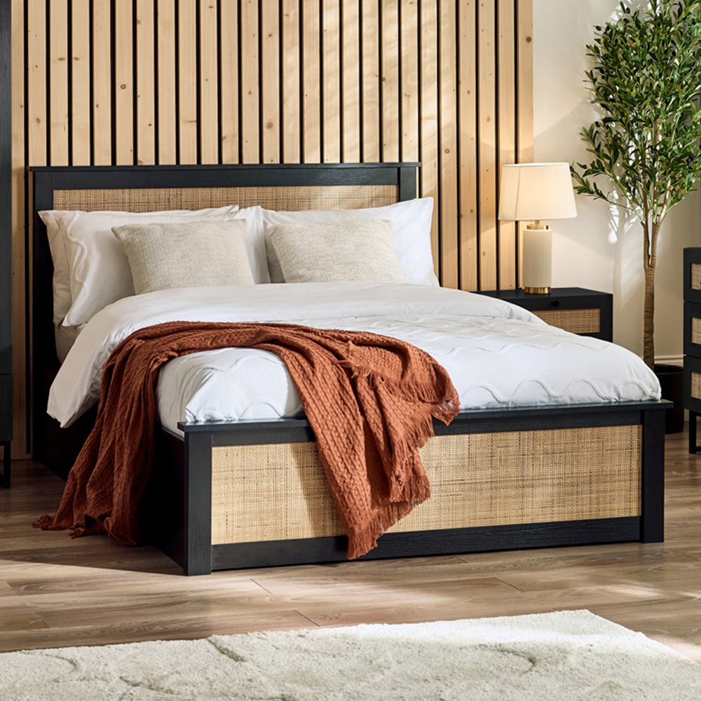 Elevate your bedroom with Julian Bowen Padstow Ottoman Double Black Bed Frame. This captivating bed boasts an ornate weaved rattan headboard that adds a dash of modern elegance and retro charm to your space. Drawing inspiration from bohemian aesthetics, it effortlessly combines timeless appeal with contemporary flair. The sophisticated black finish makes a bold and chic statement in any bedroom. What sets this bed apart is its ingenious ottoman storage system, you just have to lift the frame to access ample space for bedding, clothing, or other essentials. Note: The mattress is sold separately.