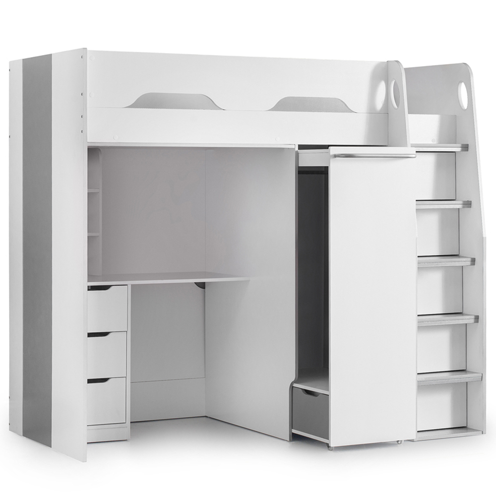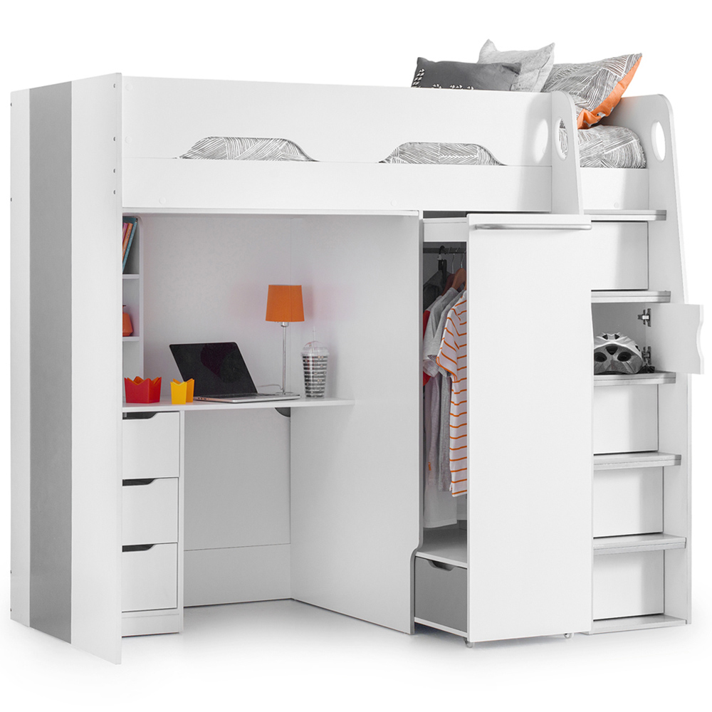 Make a classy and functional addition to your children’s bedroom with the Julian Bowen Pegasus High Sleeper with Storage. This white and silver high sleeper is ideal for your young ones and teenagers. It features a space-saving and practical pull-out wardrobe with an integral storage drawer. It also features a smooth desk with three side drawers and open shelves, ideal for creating a compact workspace. The robust ladder includes enclosed storage cupboards at every step with a comfortable bed at the top for a peaceful night’s sleep.
