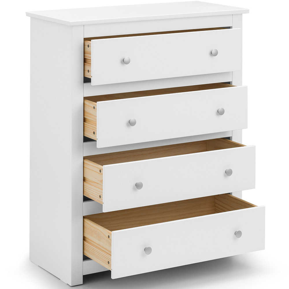Organise your home with the Julian Bowen Radley 4-Drawer Surf White Storage Chest. Boasting clean and simple lines, this chest of drawers is perfectly suited for modern or traditional styles. It features four decent-sized drawers to store away essential items at reach. Also, it comes with a spacious tabletop to display your favourite memories, place plants or keys and more. Plus, finished in a surf-white lacquer with delicate silver handles, this unit looks great when paired with coordinating furniture items.