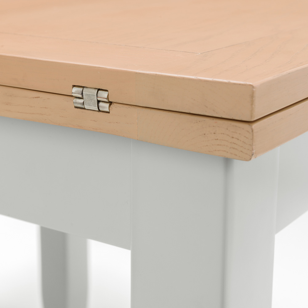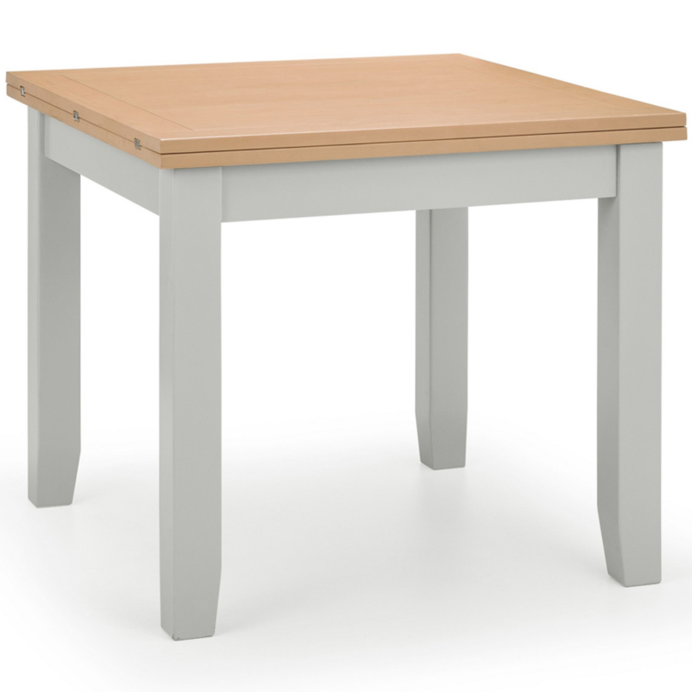 Enhance your home décor with a hint of rustic elegance with the Julian Bowen Richmond Four-Seater Oak Flip Top Dining Table. Finished in an elegant soft elephant grey with a beautiful pale oak top, this Richmond Flip-Top Table is crafted from a combination of high-grade white oak solids and veneers. The table allows you to easily double your dining space by simply flipping the top over, creating more space when you have guests, and when you are done, simply flip the top back over to save floor space when not in use. The combination of superior-quality materials and classic design ensures a timeless appeal and fits perfectly alongside both traditional and contemporary decor. It is also part of the extensive Richmond Dining and Occasional furniture range from Julian Bowen.