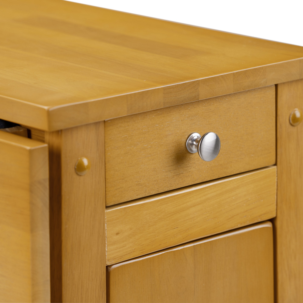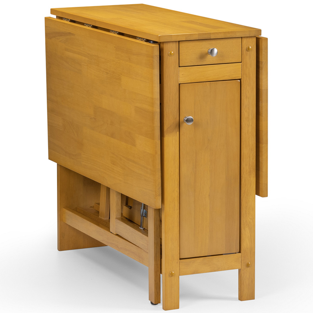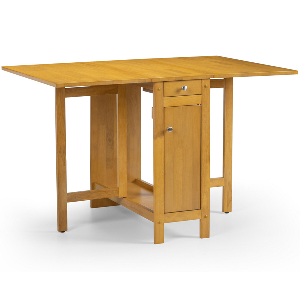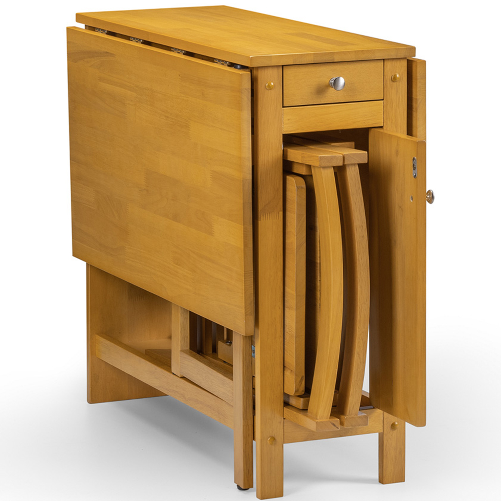 Uniquely enjoy your meal with this Julian Bowen Savoy Light Oak Four-Seater Dining Set. Finished in a low-sheen light oak lacquered, this dining set has a timeless classic design that features an integrated storage drawer and is a perfect choice for small spaces with limited storage. The set includes a table and four fold-away chairs that can be folded and stored inside the table. With its unique foldable design, this dining set can be the ideal choice to add to your dining room.