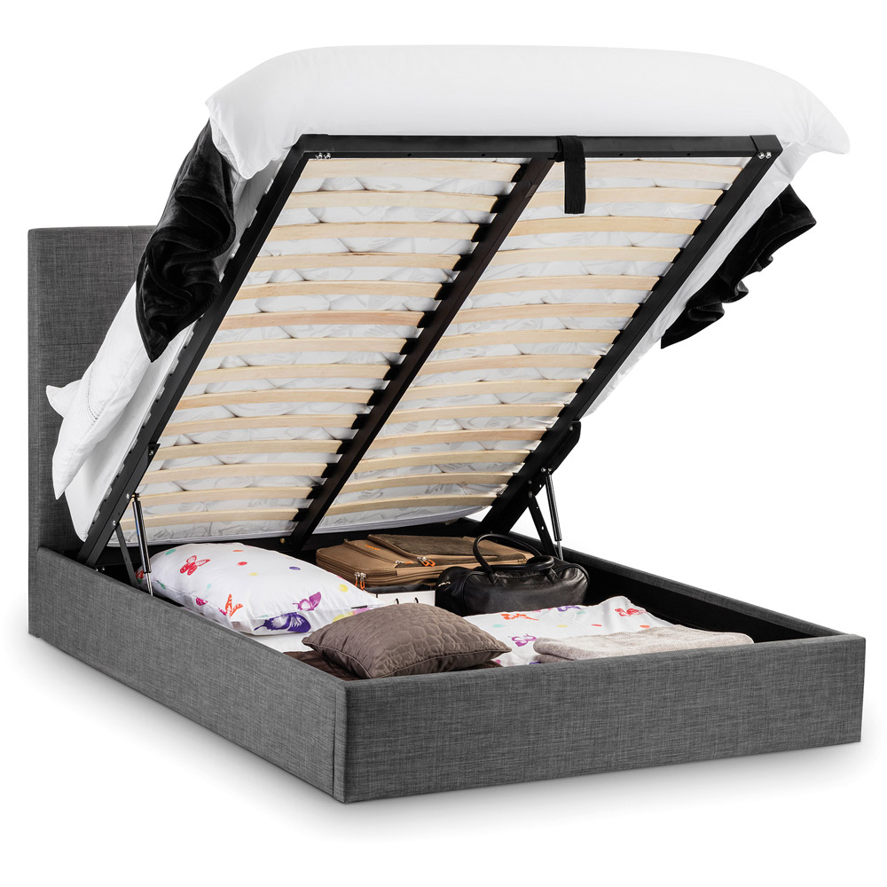 Redefine your sleep sanctuary with the Julian Bowen Sorrento King Size Slate Grey Linen Ottoman Bed Frame, a stunning fabric bed, beautifully upholstered in a sophisticated slate grey linen fabric. The contemporary high headboard with immaculately finished diamond-shaped feature buttoning makes an impressive style statement, while a gas-powered lift-up ottoman offers a phenomenal amount of storage space. The sprung slatted base ensures a good night's sleep and a prolonged mattress life. With its perfect blend of functionality, style, and durability, it will be a valuable addition to your space.