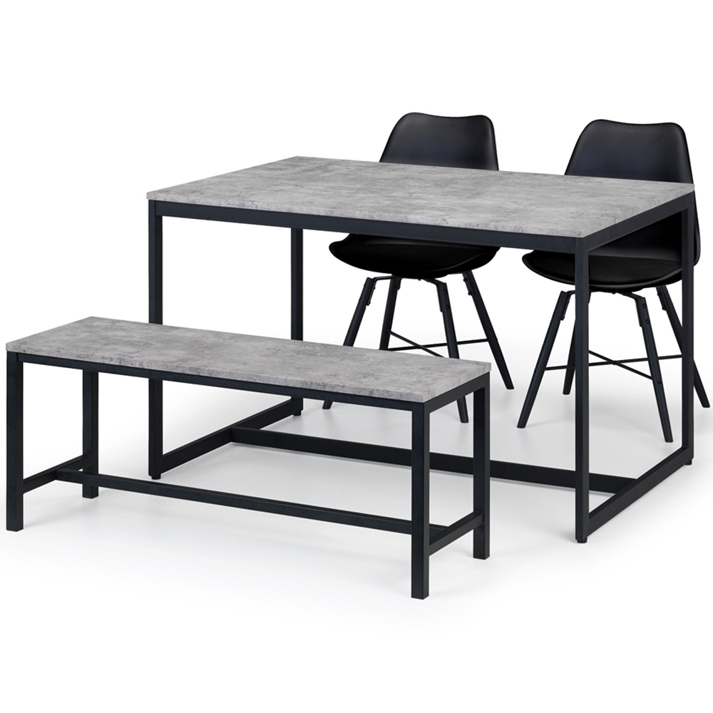 Bring style and sophistication to your dining space with the Julian Bowen Staten Kari Concrete Effect 4 Seater Dining Set with Bench Black. Simplistic in design with a contemporary style, this table will add a stunning industrial look to any living and dining area. Constructed from a black coated metal frame, complemented by a striking concrete effect tops, to create a very stylish, modern product. It is paired with two stylish chairs and a bench.