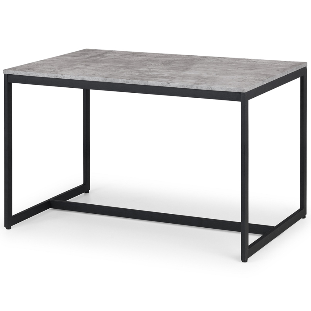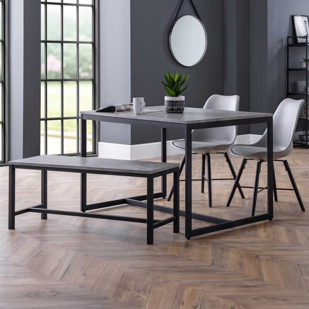 Bring style and sophistication to your dining space with the Julian Bowen Staten Kari Concrete Effect 4 Seater Dining Set with Bench Grey. Simplistic in design with a contemporary style, this table will add a stunning industrial look to any living and dining area. Constructed from a black coated metal frame, complemented by a striking concrete effect tops, to create a very stylish, modern product. It is paired with two stylish chairs and a bench.
