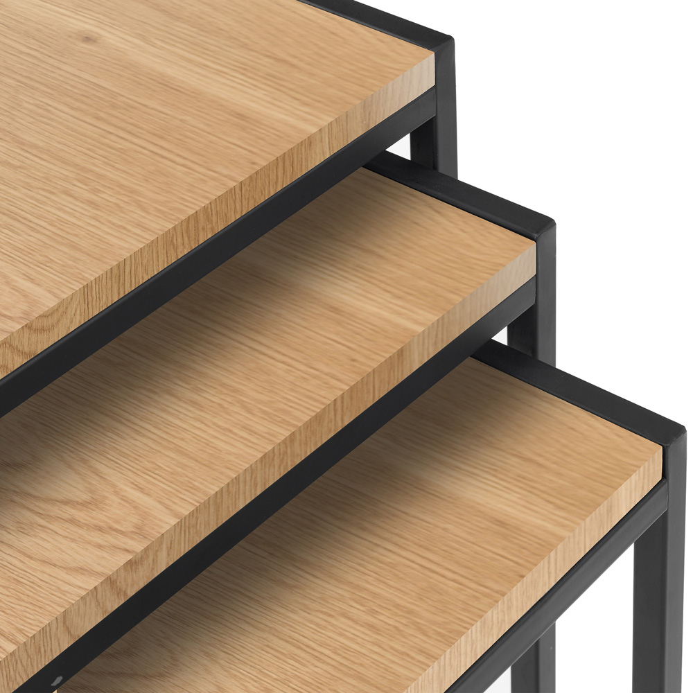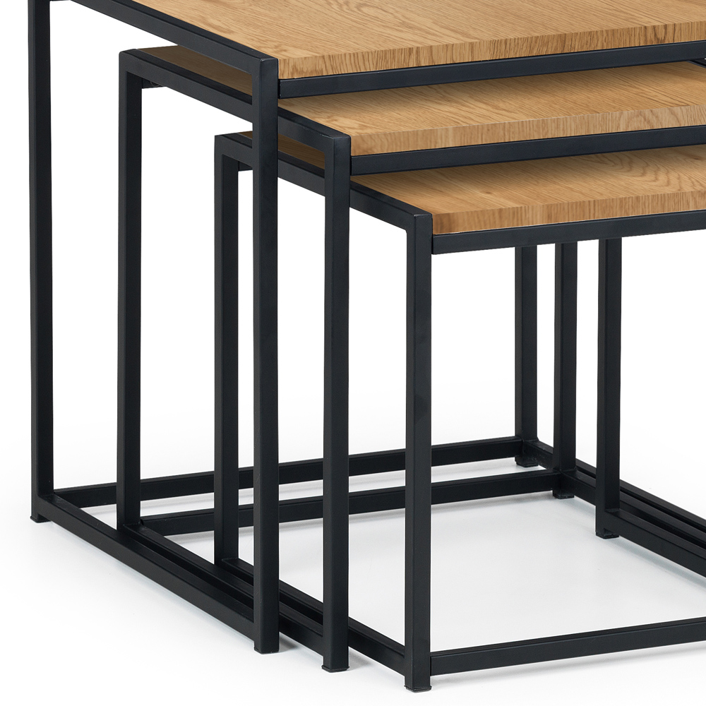 Elevate your living space with the Julian Bowen Tribeca Euro Oak Nest of Tables Set of 3. Offering three tables, their simple clean lines, delineated by a subtle, black coated metal frame are complemented perfectly by a stunning Euro Oak foil, to create a very stylish and sleek product. Simple yet practical, they will make a fine addition to your decor. Set of three.