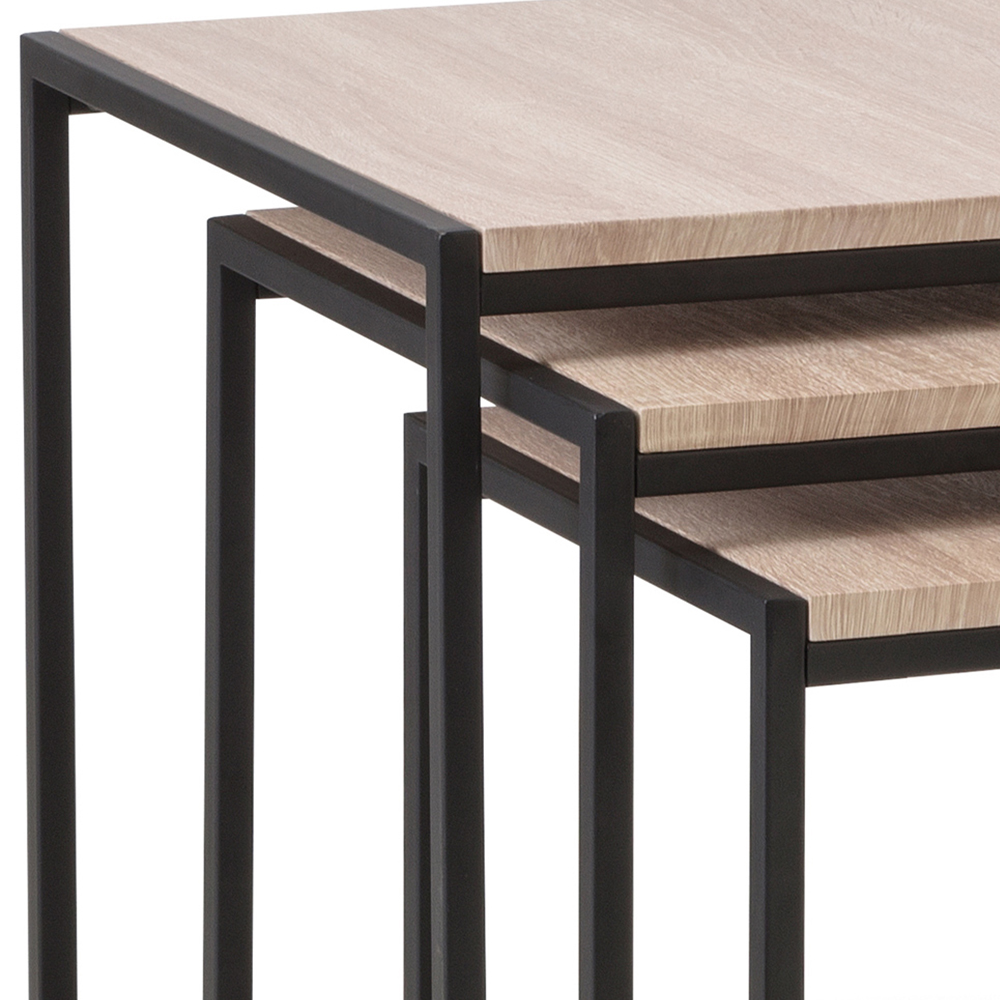 Elevate your living space with the Julian Bowen Tribeca Sonoma Oak Nest of Tables Set of 3. Offering three tables, their simple clean lines, delineated by a subtle, black coated metal frame are complemented perfectly by a warm, Sonoma oak foil, to create a very stylish and sleek product. Simple yet practical, they will make a fine addition to your decor. Set of three.