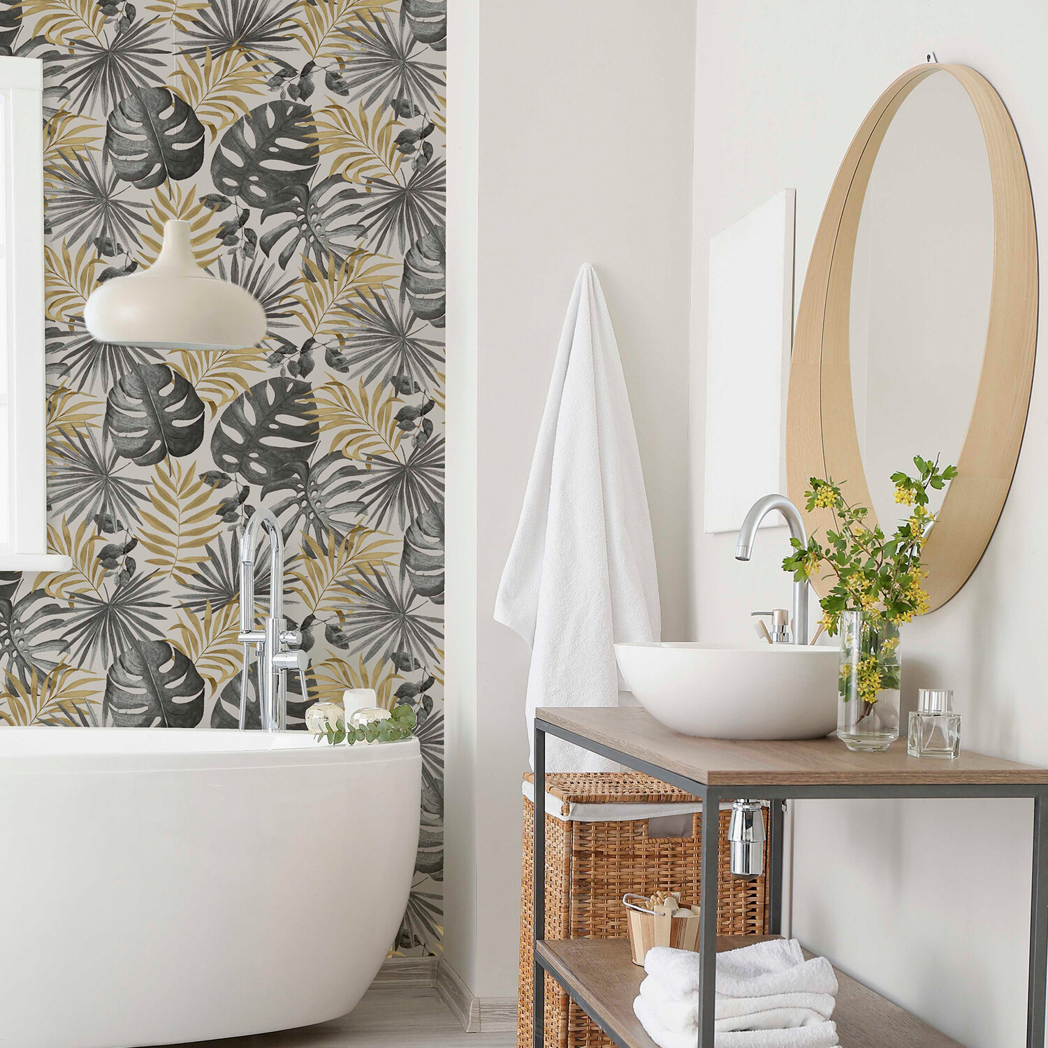 Transform your space with the Jungle Wallpaper. Decorated with striking palm prints and shimmering gold accents, this design features a bold blend of elegance and exotic charm, adding a luxurious touch to any room. Its washable surface withstands frequent cleaning while its peelable nature allows you to switch up your decor with ease.