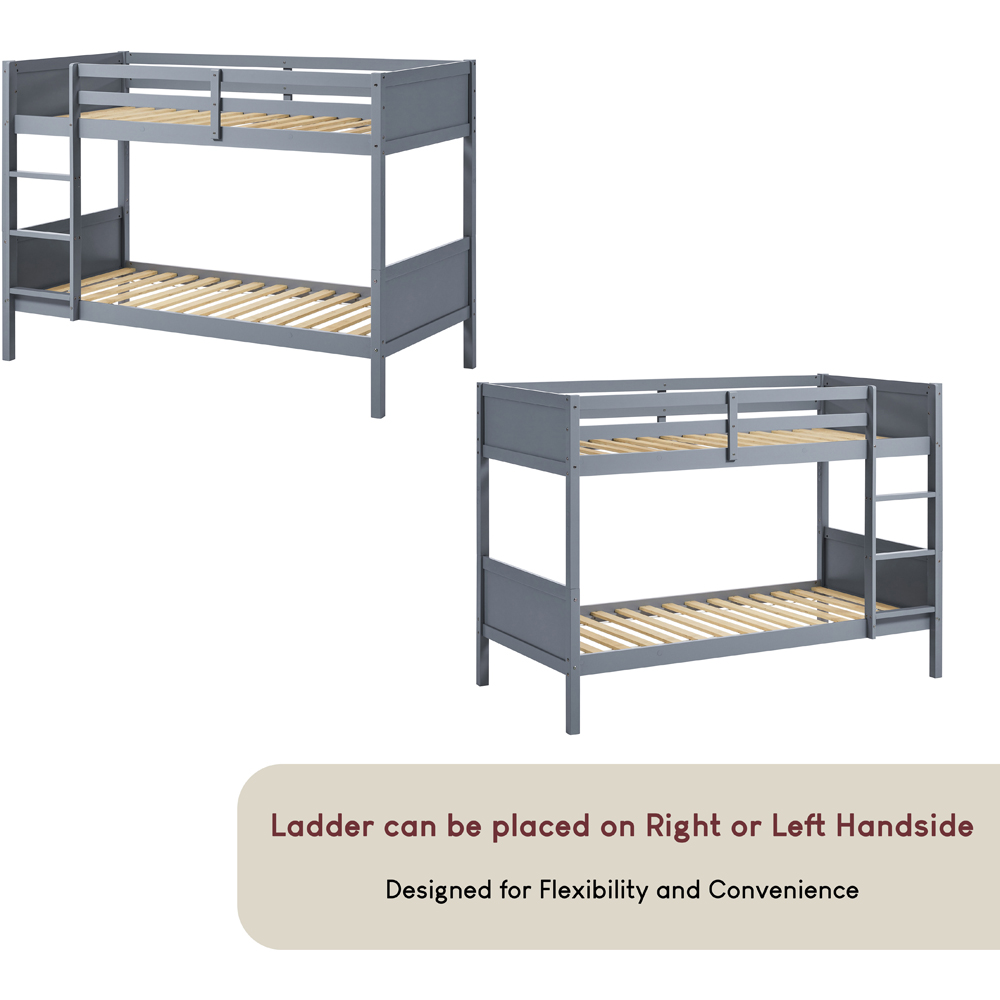 The Junior Vida Gemini Grey Detachable Bunk Bed is a versatile and modern sleeping solution for your home. This bunk bed features two 3ft single beds, providing comfortable and spacious sleeping spaces for both the top and bottom bunk. Designed with flexibility in mind, the Gemini Bunk Bed comes with a convenient ladder that can be positioned on either the left or right-hand side. This allows for easy access to the top bunk, ensuring safety and ease of use. One of the standout features of the Gemini Bunk Bed is its ability to transform into two separate beds, offering even more flexibility for your space. As your needs change or your children grow, you can easily separate the bunk beds into two individual single beds, providing additional sleeping options. Crafted with quality and durability in mind, the Gemini Bunk Bed is built to withstand the demands of daily use. The sturdy construction ensures a stable and secure sleeping environment, giving you peace of mind while you rest. Create a comfortable and functional bedroom with the Gemini Bunk Bed, making the most of your floor space without compromising on style. The sleek and modern design adds a touch of elegance to any room, complementing various interior themes. Whether you have children sharing a room, need a space-saving solution for a guest room, or want the flexibility to accommodate guests, the Gemini Bunk Bed is a practical and stylish choice. Weight Limit: 140kg Per Bunk. Please Note: This item requires self-assembly with easy-to-follow instructions provided. The actual colour of the product may vary slightly as your screen display setting and lighting with your home environment may differ from our own.
