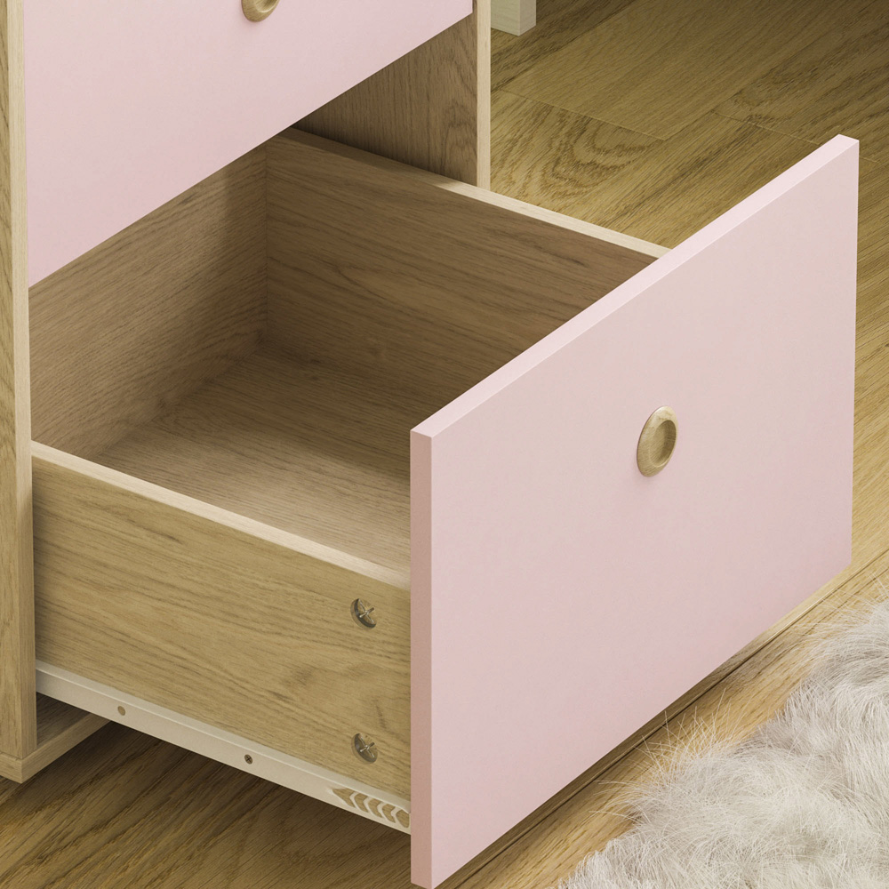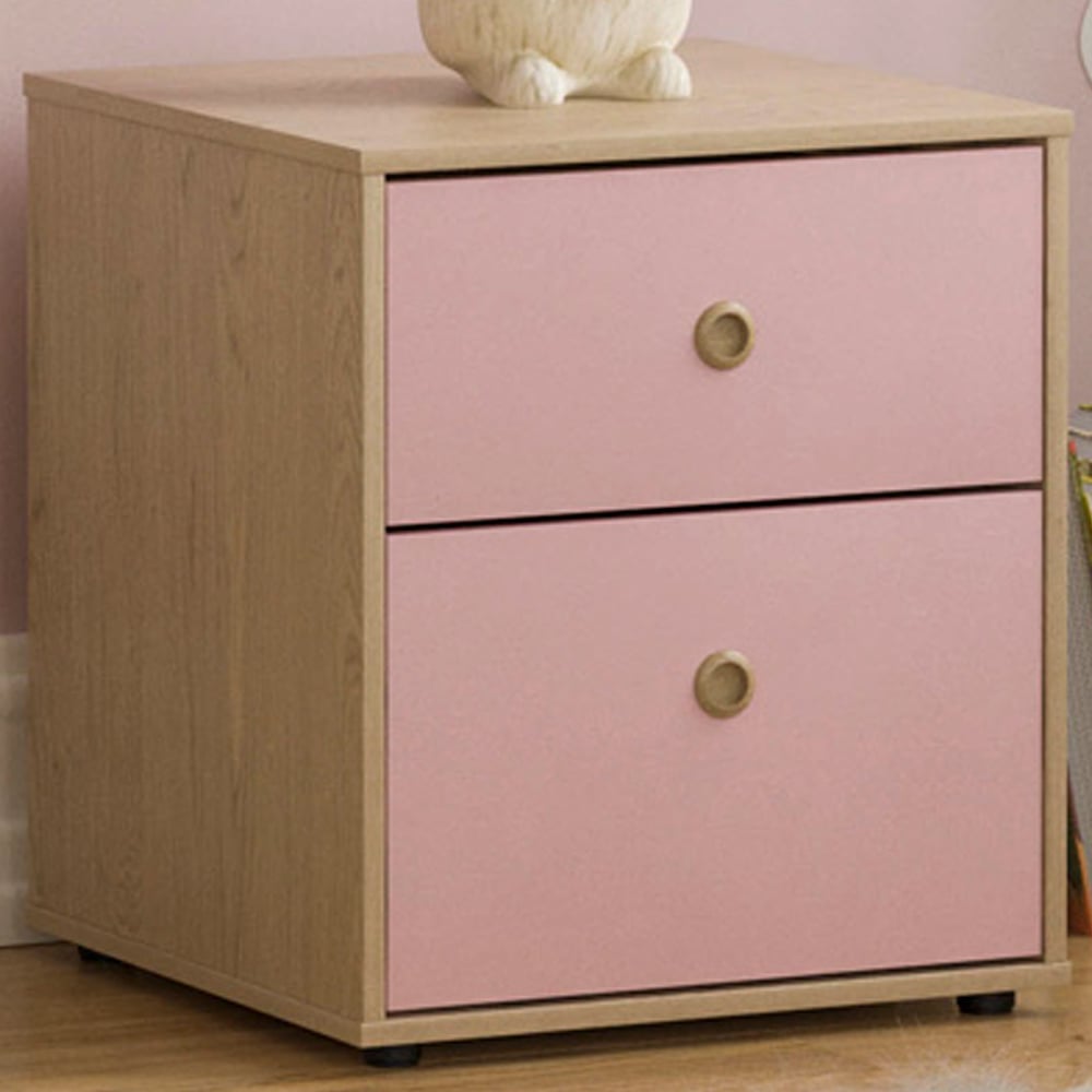 Introducing the Junior Vida Neptune 2 Drawer Pink and Oak Bedside Table, where style and practicality come together to elevate your bedroom decor. Crafted with a child-friendly design, this bedside table ensures safety and convenience for your little ones. The bedside table is thoughtfully designed with smooth edges and a sturdy build, providing a secure storage option for children. You can have peace of mind knowing that your child's safety is a priority with this piece of furniture. Adding a touch of sophistication, the bedside table features wooden inset handles that not only enhance its visual appeal but also offer easy access to the drawers. The elegant handles complement the overall design, making it a standout piece in any bedroom. With two spacious drawers, the bedside table offers ample space to keep your bedtime essentials within reach, helping you maintain a clutter-free and organised bedroom. Plus, the drawers glide smoothly, providing seamless functionality. Please Note: This item requires self-assembly with easy-to-follow instructions provided. The actual colour of the product may vary slightly as your screen display setting and lighting with your home environment may differ from our own. Weight Limit: 5kg per drawer and 25kg tabletop.