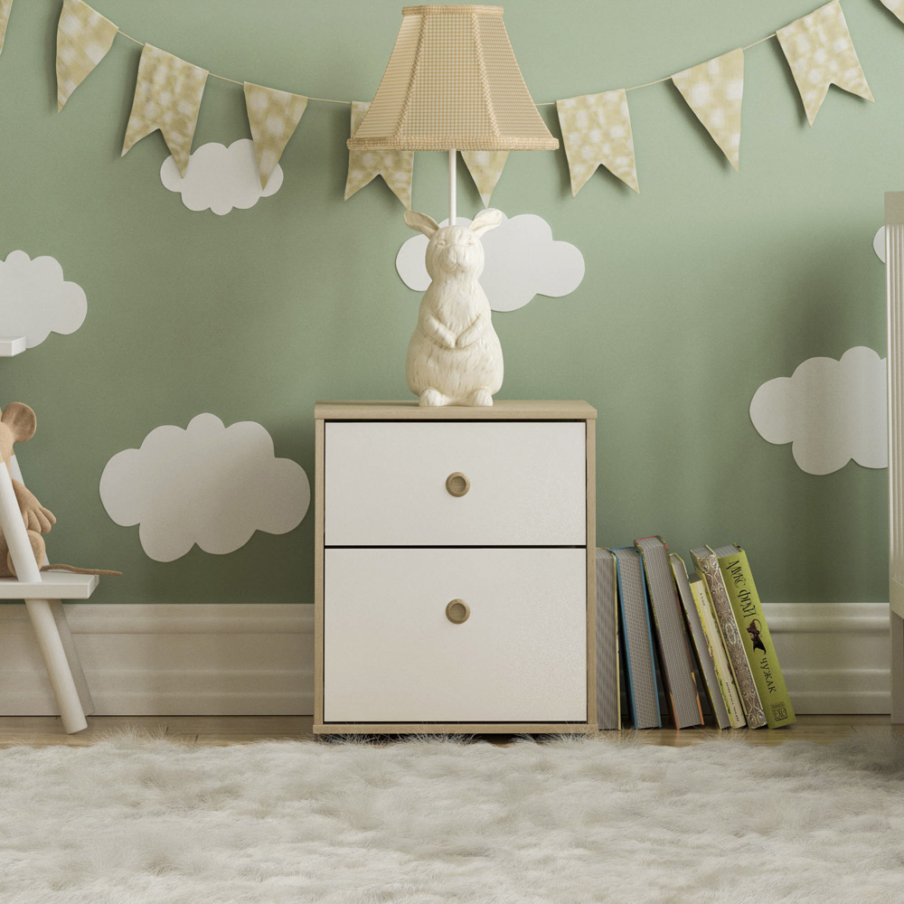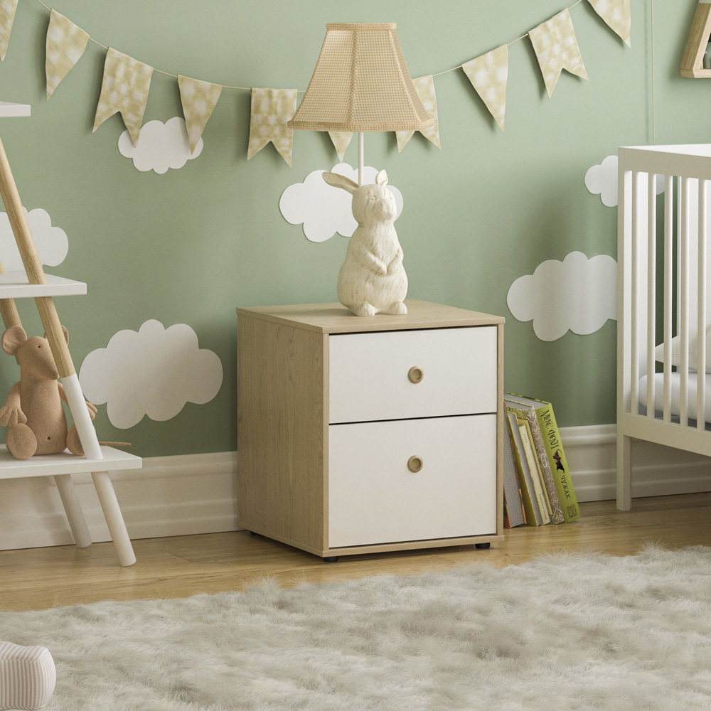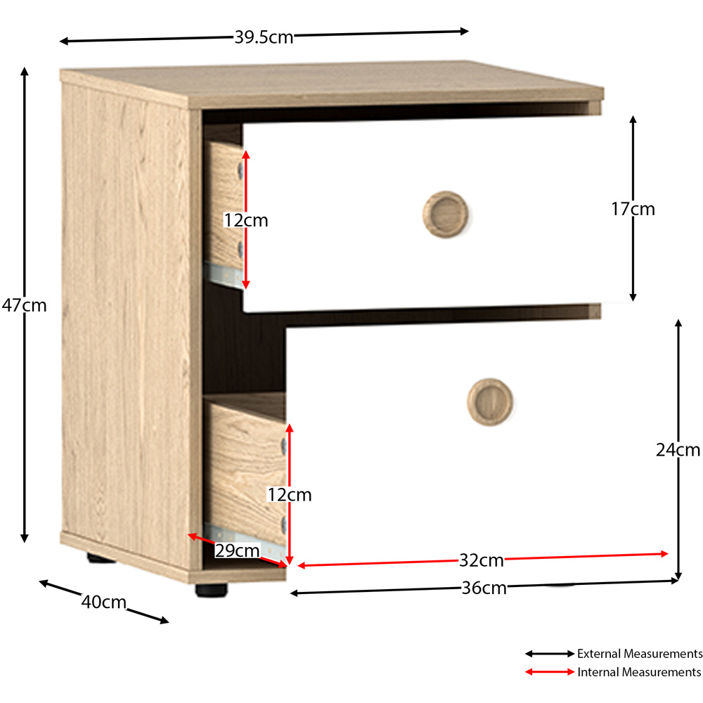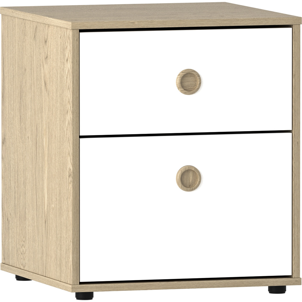 Introducing the Junior Vida Neptune 2 Drawer White and Oak Bedside Table, where style and practicality come together to elevate your bedroom decor. Crafted with a child-friendly design, this bedside table ensures safety and convenience for your little ones. The bedside table is thoughtfully designed with smooth edges and a sturdy build, providing a secure storage option for children. You can have peace of mind knowing that your child's safety is a priority with this piece of furniture. Adding a touch of sophistication, the bedside table features wooden inset handles that not only enhance its visual appeal but also offer easy access to the drawers. The elegant handles complement the overall design, making it a standout piece in any bedroom. With two spacious drawers, the bedside table offers ample space to keep your bedtime essentials within reach, helping you maintain a clutter-free and organised bedroom. Plus, the drawers glide smoothly, providing seamless functionality. Please Note: This item requires self-assembly with easy-to-follow instructions provided. The actual colour of the product may vary slightly as your screen display setting and lighting with your home environment may differ from our own. Weight Limit: 5kg per drawer and 25kg tabletop.