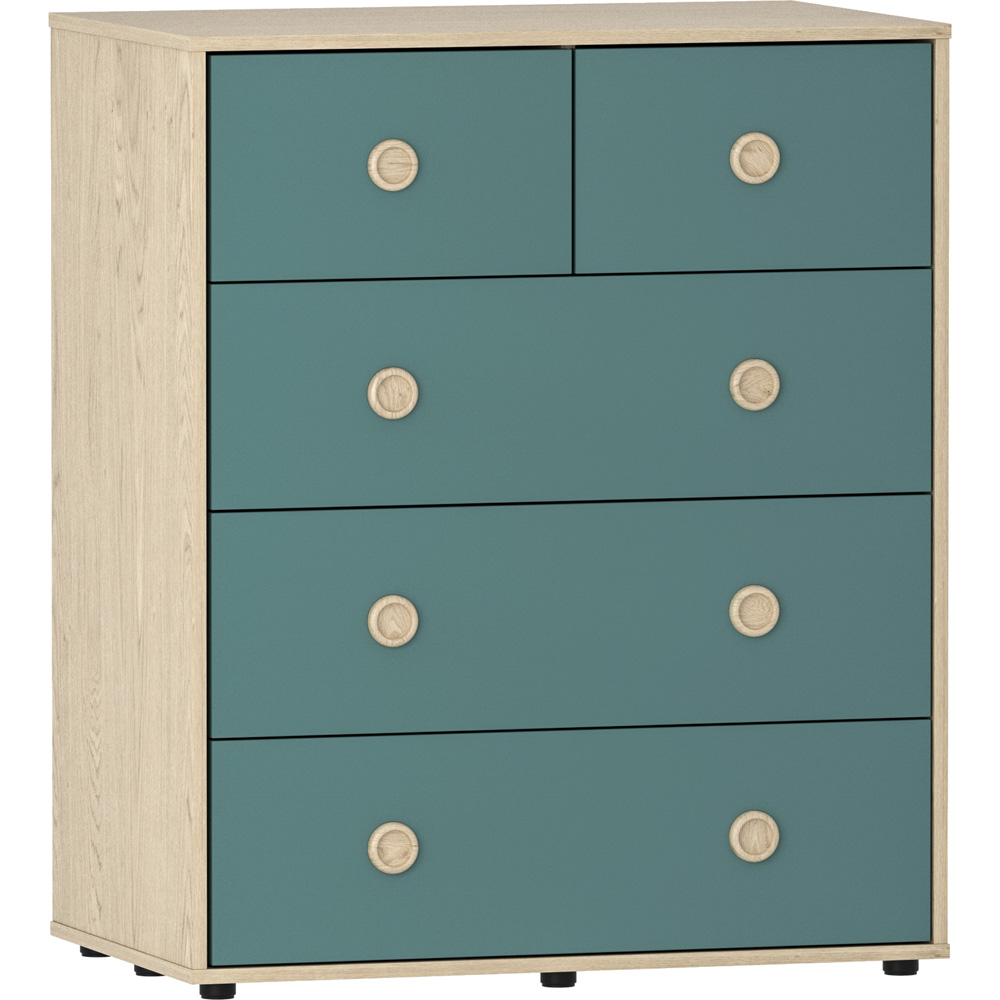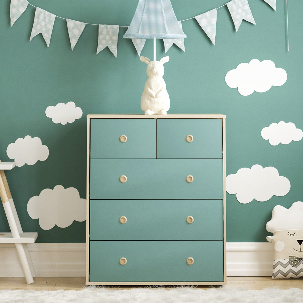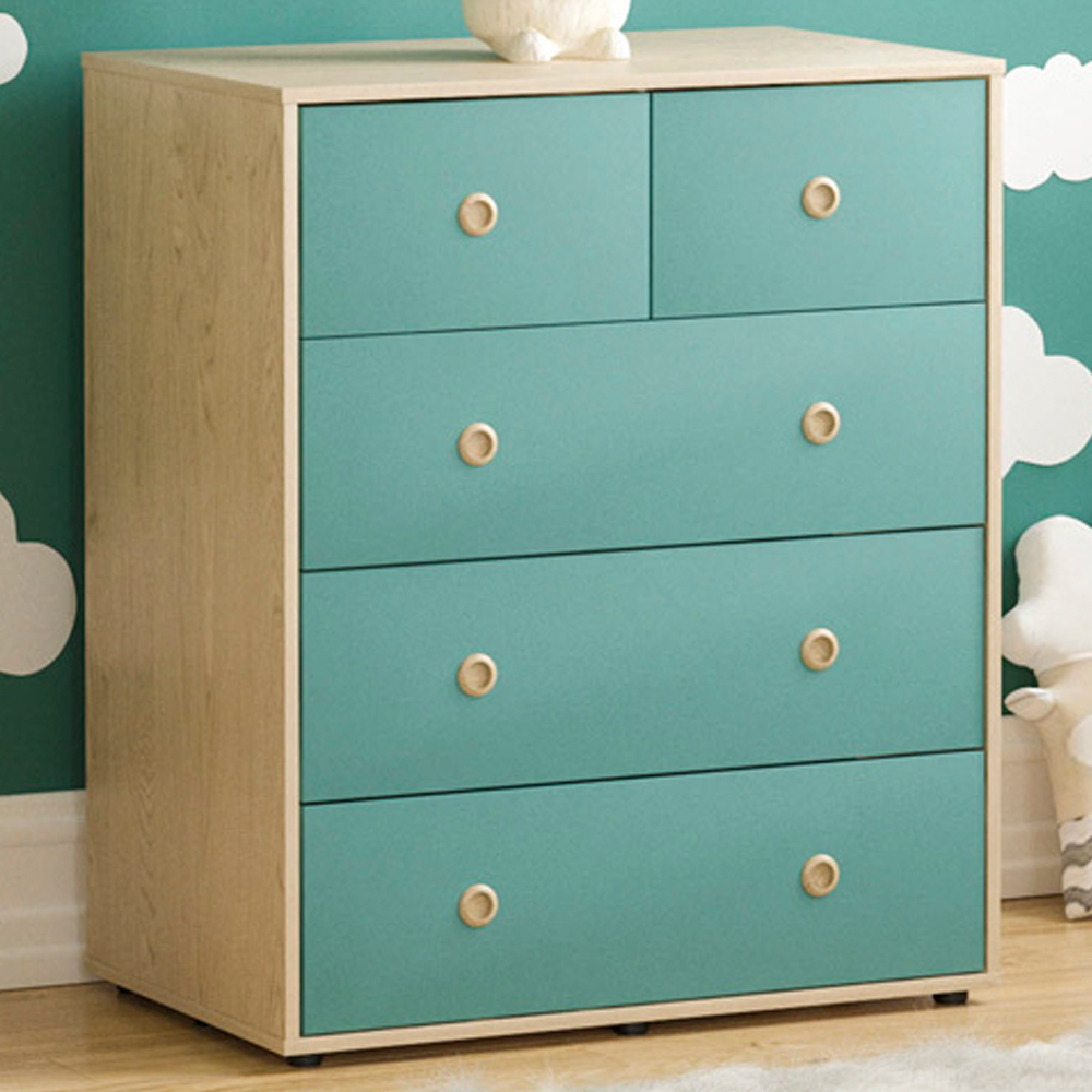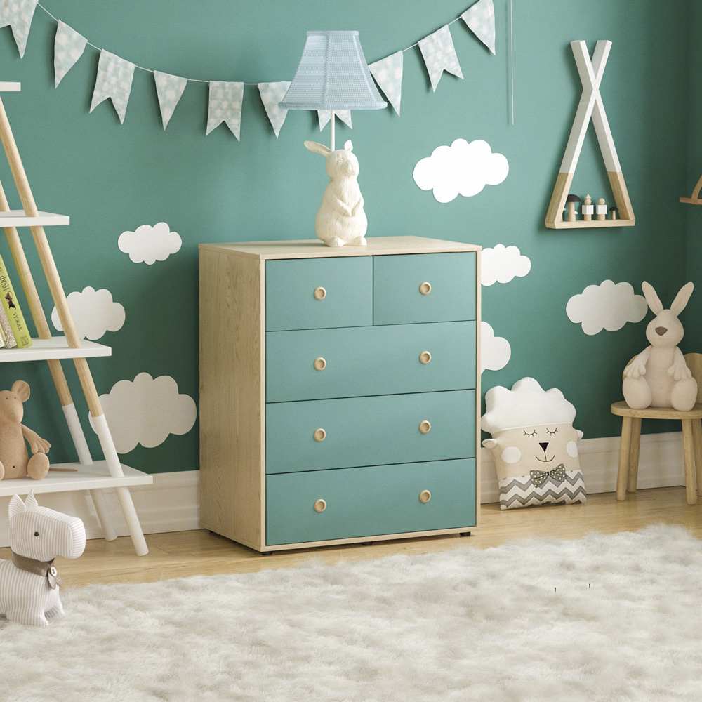 Introducing the Junior Vida Neptune 5 Drawer Blue and Oak Storage Chest, where style meets functionality in perfect harmony. This chest is tailored with your child's safety in mind, featuring a child-friendly design with smooth edges and a sturdy build to create a secure storage solution for your little ones. Elegance and charm come together with the wooden inset handles, adding a touch of sophistication to the chest's overall design. These handles not only enhance its visual appeal but ensure easy and convenient access to the drawers. Say goodbye to clutter and welcome ample storage space with five spacious drawers. So, whether it's clothes, accessories, or linens, the storage chest allows you to keep everything organised and within easy reach. Crafted with the utmost care and attention to detail, this chest of drawers is built to last. Plus, its high-quality construction ensures durability, making it a reliable piece of furniture for years to come. Please Note: This item requires self-assembly with easy-to-follow instructions provided. The actual colour of the product may vary slightly as your screen display setting and lighting with your home environment may differ from our own. Weight Limit: 5kg per drawer and 25kg tabletop.