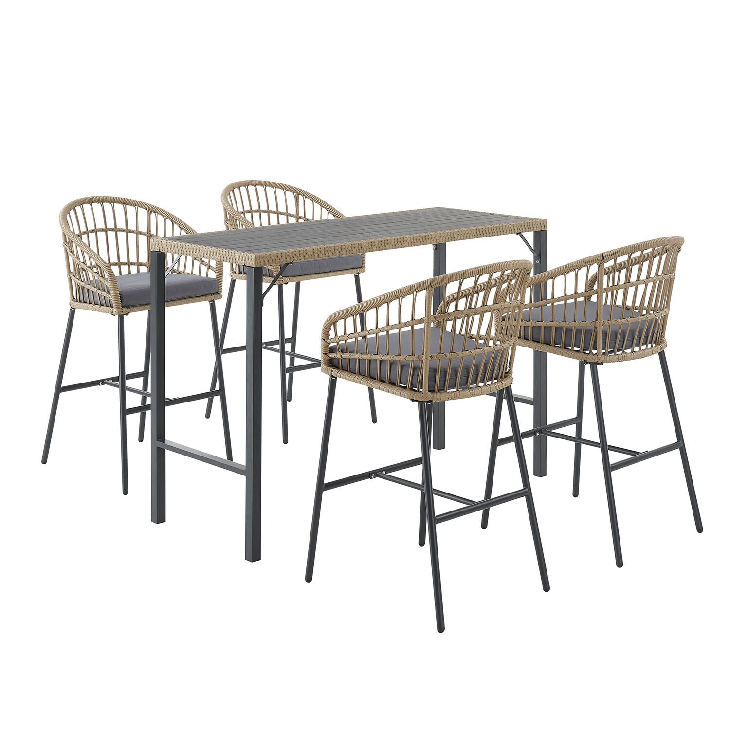 Modern and stylish, the Juno Bar Set will instantly enhance your dining experience. Flaunting a charming rattan design, the chairs have a tall build to make you feel like you're enjoying a meal in a contemporary bistro. The table stands on long legs and is fitted with a hand-brushed top to give the set a sophisticated appearance. Bring this set to your home to enhance your decor effortlessly.