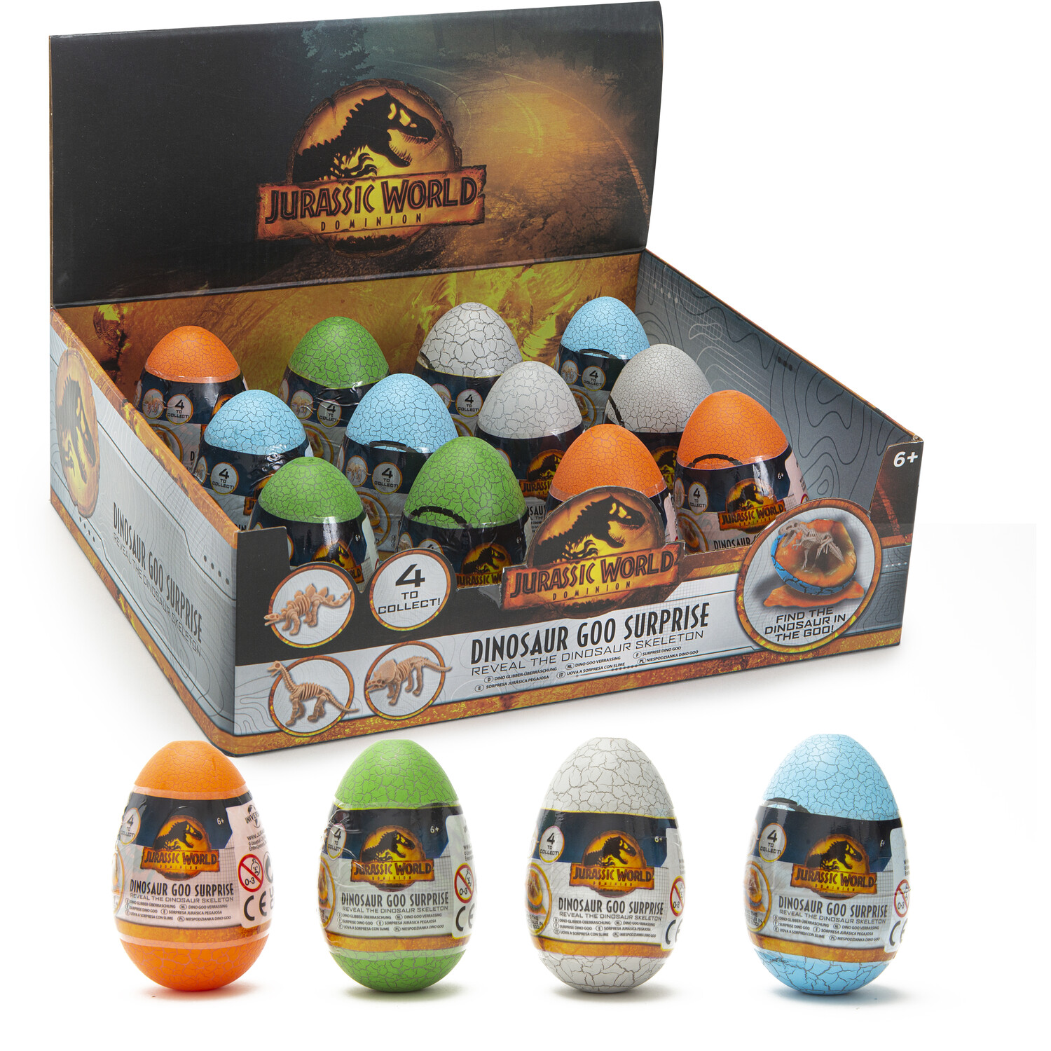 The perfect gift for any little Jurassic World fan, the Jurassic World Dinosaur Goo Surprise egg will have them roaring with excitement. Reveal the dinosaur skeleton in the goo and see if you can collect all four. Collect the skeletons, put them on display, and then play with the stretchy goo.