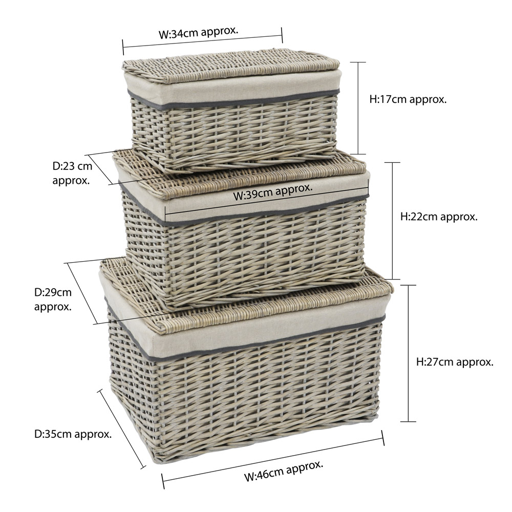 Organise your home in style with this JVL Arianna Grey Rectangular Hamper Storage Basket. This beautiful set of three baskets is perfect for use around the home. Handmade and woven from willow, it gives a traditional feel, while the antique wash colour makes it suitable for most interior styles. Perfect for the bathroom, laundry and utility room or bedroom. Made using renewable material - the artisans use raw fibres to handcraft the woven baskets. Complete with lining for easy cleaning – the woven design makes the basket strong and durable. The set includes baskets in various sizes: Large H27 x W46 x D35cm approx. Capacity: 43L approx. Medium H22 x W39 x D29cm approx. Capacity: 25L approx. Small H17x W34 x D23cm approx. Capacity: 13L approx.