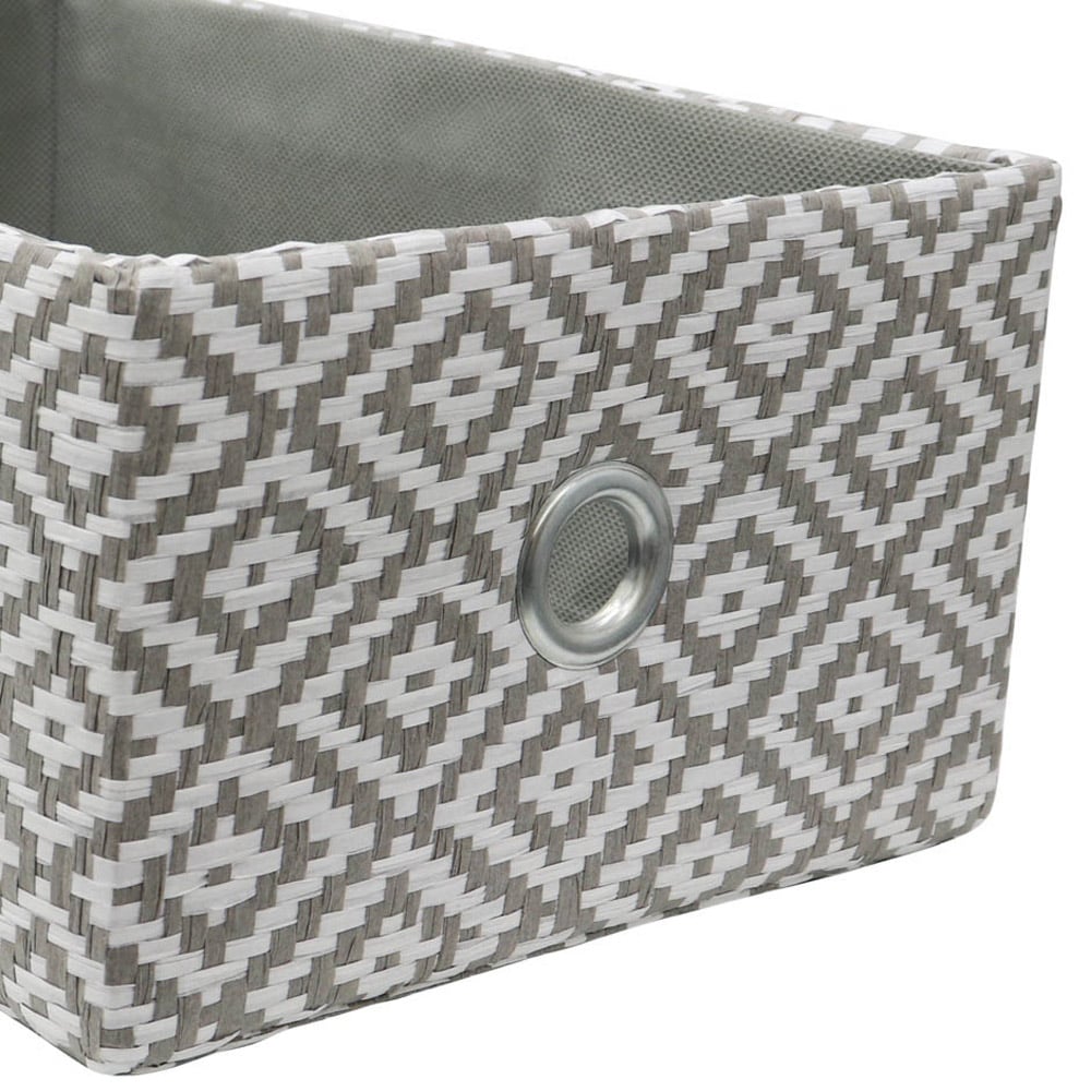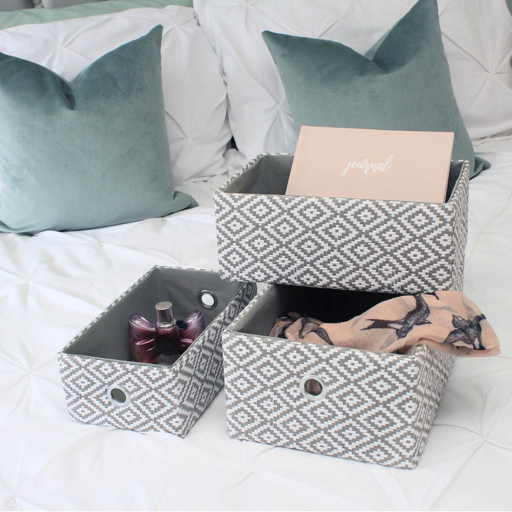 Declutter your home in style with these JVL Argyle Grey Rectangular Paper Storage Baskets. Stylish and practical, these storage baskets feature a diamond pattern on a soft grey colour palette to work well with all interiors. Diamonds are a huge trend and can be spotted on celebs as well as in well-known interior ranges and high-street stores. Easy to use, they come in an open design for storing bits and pieces around the home, such as in a bedroom, living room, playroom, utility room, or children’s bedrooms. Ideal for small garments, jewellery, makeup, toys, towels, linens, baby products, and more. Set of 3. Size: Large: H14 x W32 x D22cm, Medium: H12 x W29 x D19cm and Small: H10 x W26 x D16cm. Capacity: Large: 9.5L, Medium: 6.5L and Small: 4L.