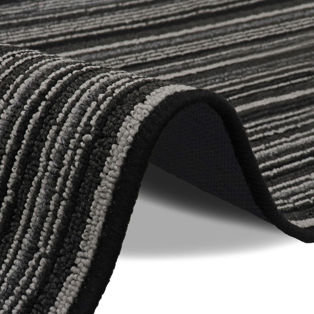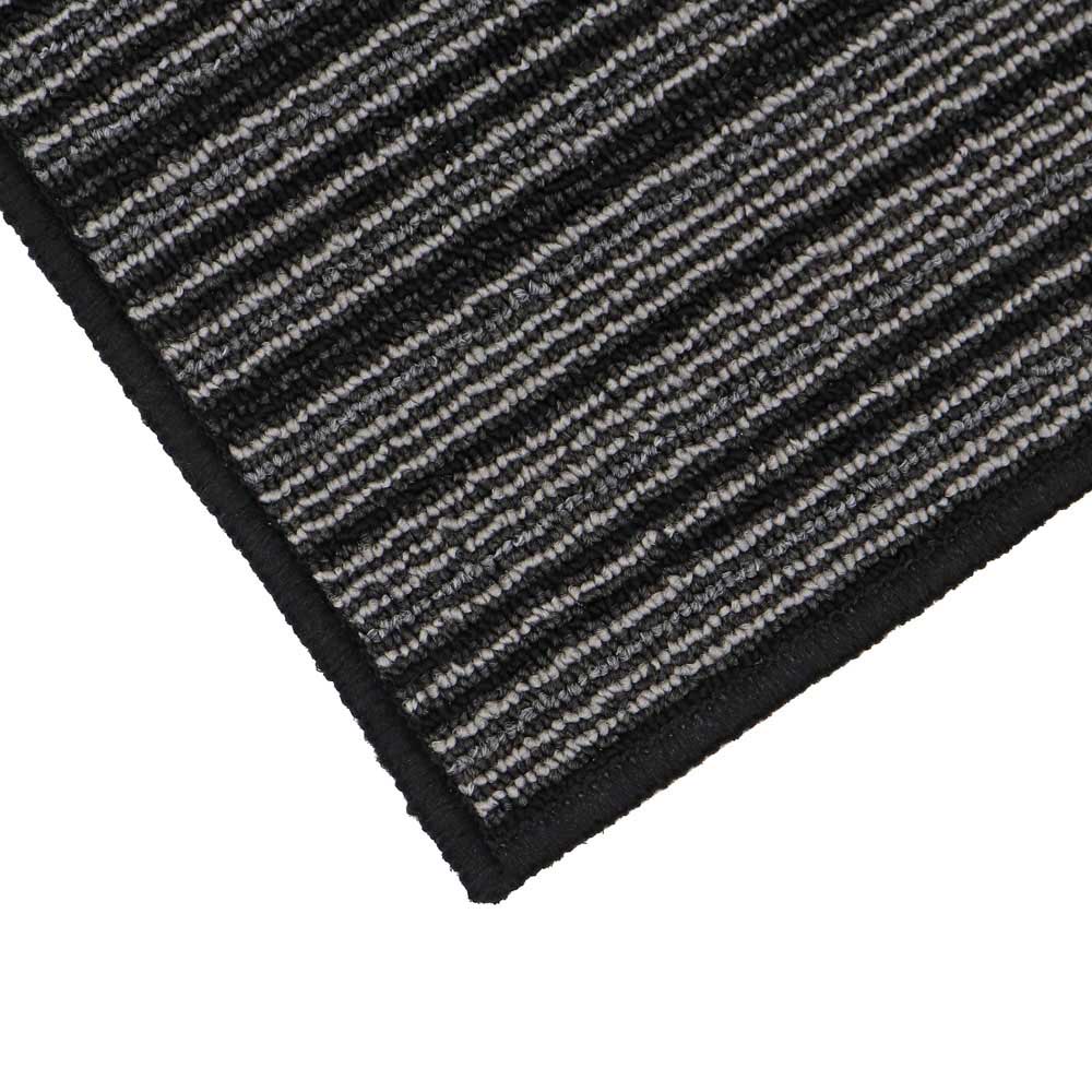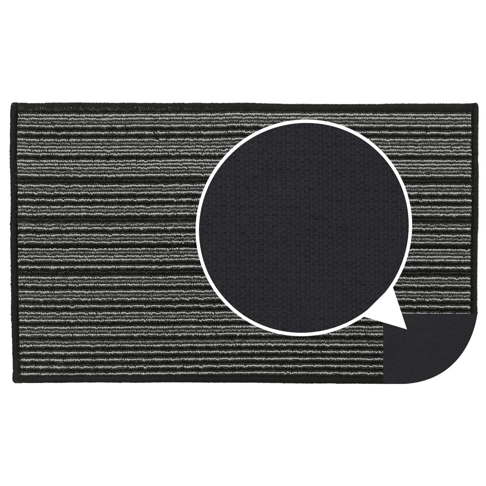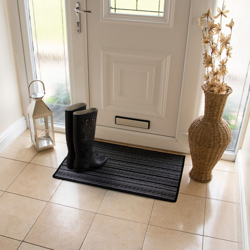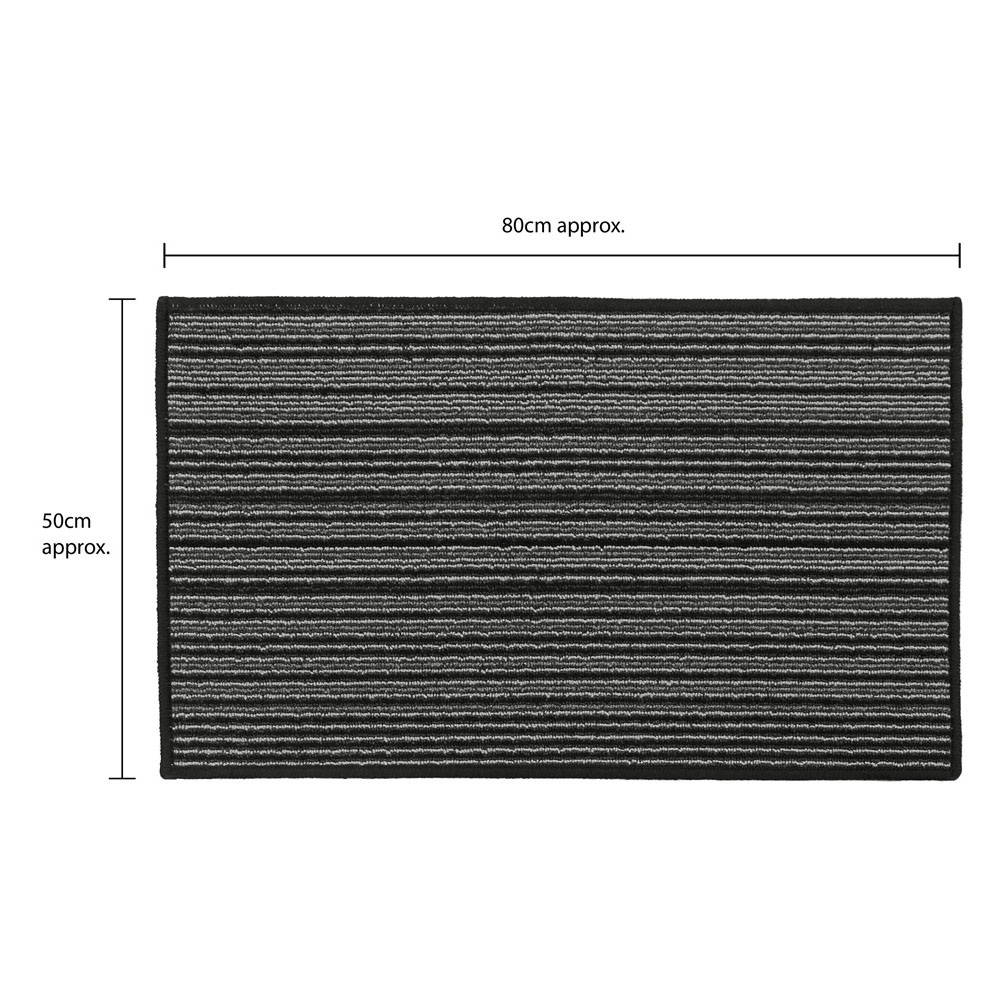 Inject style and function in your space with this JVL Arona Black Indoor Machine Washable Doormat. Features a subtle black striped pattern designed to suit any entrance, kitchen or hallway. The doormat has a latex backing to prevent movement while wiping shoes or feet. It is a functional and decorative enhancement designed to help prolong the life of all types of flooring from wood, tiles or carpet. It soaks up excess moisture to prevent slipping hazards, and the fibres trap dust and dirt, keeping floors cleaner for longer. When the mat gets dirty, machine wash it at 30 degrees, and it will look brand new. Suitable for indoor use. Size: 50 x 80cm approximately.