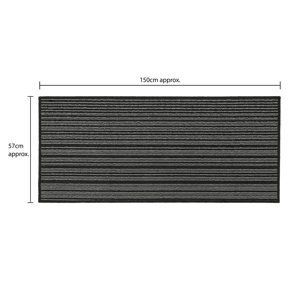 Enhance the functionality and style of your entrance, hallway, or kitchen with the JVL Arona Black Indoor Washable Runner. This runner is designed to prolong the life of your hard floors or carpet while adding a subtle decorative touch. The runner features a subtle black striped design that complements most decor styles, providing an attractive enhancement to any space. Its fibres effectively trap dust and dirt, keeping your floors cleaner for longer. Moreover, they absorb moisture, preventing wet floors and potential slipping hazards. This runner keeps mud and moisture at the door, protecting all types of flooring, whether wood, tiles, or carpet. The latex backing ensures reduced movement as you wipe your feet, enhancing stability and safety. Cleaning the Arona runner is a breeze. Simply toss it in the washing machine at 30 degrees Celsius, and it will come out looking fresh and clean, ready to adorn your space once again. Its moisture-absorbing properties and machine-washable nature make it a practical choice for indoor use. Size: 57 x 150cm approximately.