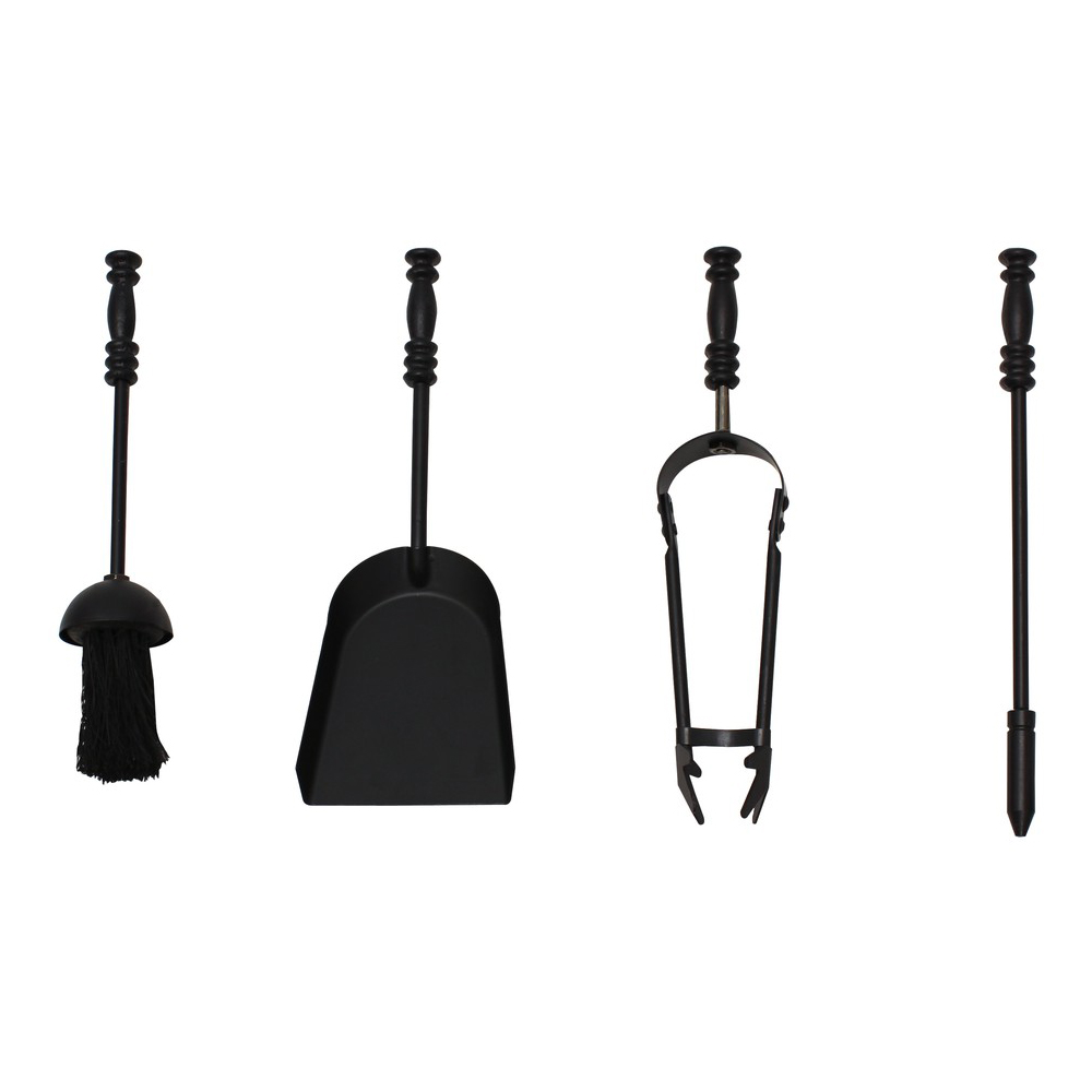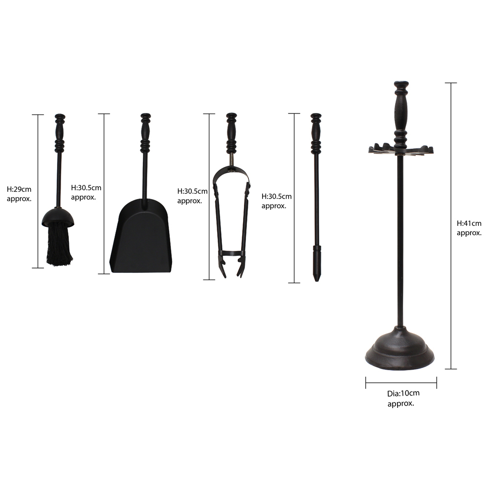 Keep the fireplace tidy while stocking the fire with JVL Belvoir Four Piece Companion Set. It's a perfect fireside accessory to compliment your living room and is also practical, and can be used to sweep away cooled coal dust. This four-piece classic fireside tool set includes a poker, tongs, brush and shovel held on a stand. It's used to brush up light dust and debris when cool. Manufactured from cast iron and steel, this wet is durable and long-lasting. Size: H41 x W10 x D10cm approx. Weight: 2kgs approx.