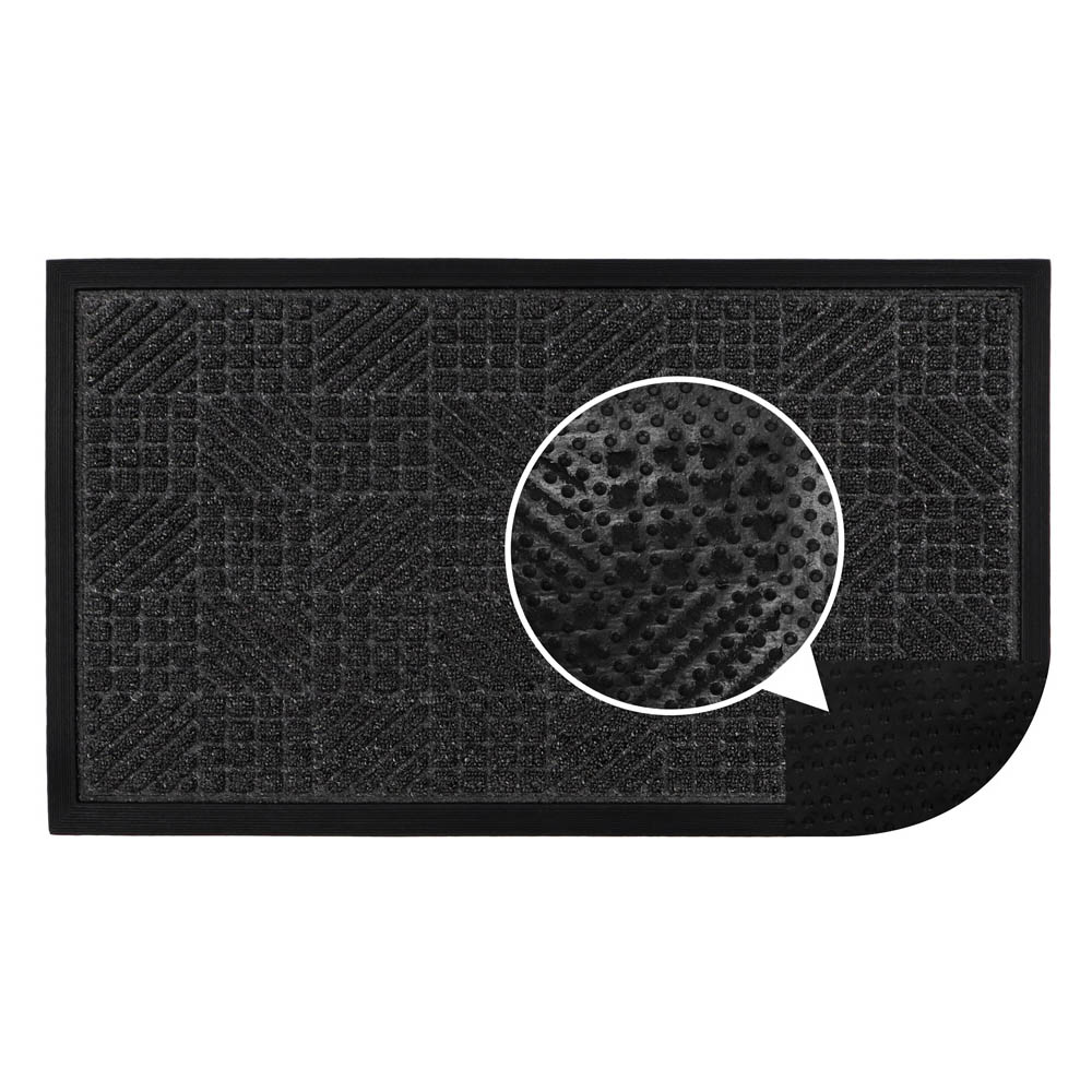 Ideal for indoor use, the JVL Firth Rubber Doormat features a tile effect design to complement any entrance in or around the home. The raised surfaces and combination of materials allow shoes to be wiped easily, while the fibres hold moisture and trap dust and dirt keeping floors cleaner for longer. Great doormat for the home or office, the pattern creates a raised surface for scraping your feet clean to prevent the dirt from trailing through the home. The fibres help trap dirt and moisture, keeping your floors cleaner for longer and preventing excess water on your floor. Robust, yet stylish doormat the raised surface creates an eye-catching design, so it looks great too while the charcoal colour complements the neutral decor. The textured rubber underside helps keep the mat in place on most surfaces when wiping your feet. Material: 100% Polypropylene pile with a rubber backing. Plus, it is easy to clean - simply shake the brush or lightly vacuum it to maintain the pile surface. Size: 40 x 70cm approximately.