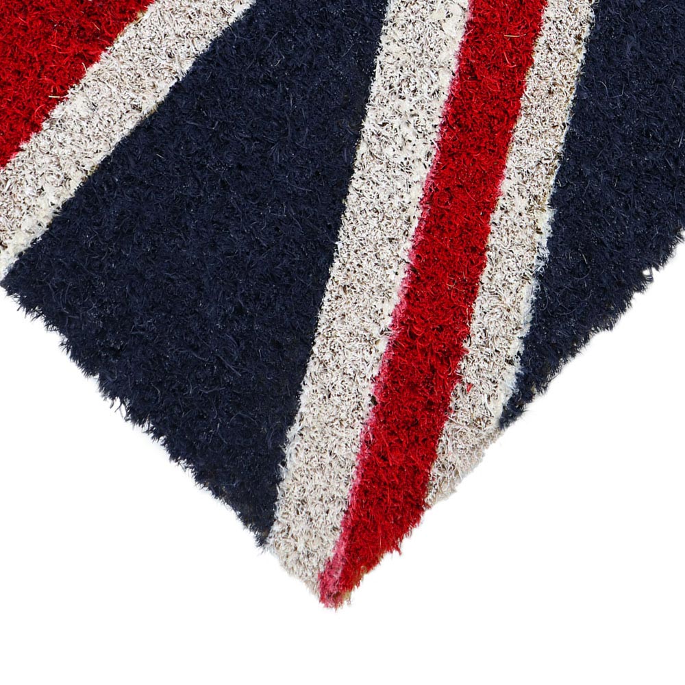 Keep all the dirt and dust outside your home with this JVL Coir Union Flag Doormat 40 x 70cm. Latex coir mats are premium quality with a latex backing, and the coir is mechanically twisted for less shedding. They’re made from 100% natural coir (renewable resources, coir fibre, jute and natural latex). The rubber latex backing reduces the risk of slipping and helps the mat stay flat on the floor with no curling. The coconut hair (natural coir) offers fantastic scraping qualities for muddy shoes and boots and absorbs water well, meaning your floors stay cleaner for longer. 15mm pile depth means the coir will get deep into the soles of boots and shoes. The doormat is suitable for all weather, all year round, and mainly used outdoors but can be used indoors too. The traditional Union Jack flag design lifts the mat and welcomes your guests. It can be used at the door, porch, greenhouse, shed, conservatory, patio or anywhere you want. The doormat is 100% biodegradable. So when you’ve finished with the mat, the natural coir will disintegrate within one year, and the latex compound will disintegrate within five years, subject to soil conditions. The packaging and kimbles are recyclable too. Size: 40 x 70cm. Weight: 1.8kg approx.