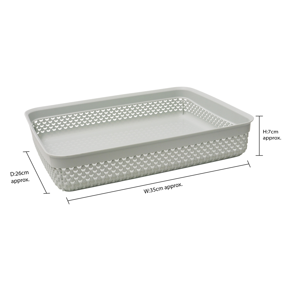 Keep your room tidy and clutter-free with the JVL Droplette 4.7L Ice Grey Storage Basket. Stylish yet practical, the Droplette range of products has been designed with an attractive droplet feature in the colour ice grey to complement any home and decor. The storage baskets are an essential item for the home to help keep you organised and clutter-free. It offers multi-functional storage options. You can store anything and everything, such as laundry products, toiletries, jewellery, makeup and more. The basket is easy to clean, and the design means it has good ventilation. The storage baskets are made from high-quality, durable material that is resistant to wear and tear. Each basket features comfortable and sturdy handles for ease of carrying and moving around. Droplet design provides good ventilation, which allows air to circulate and prevents musty smells. It can be used in the kitchen, bedroom, bathroom, laundry room, nursery and more. Easy-clean plastic - simply dust or wipe clean with a damp cloth. Durable, rust free and BPA-free. Size: H7 x W35 x D26cm approx. Capacity: 4.7L approx.