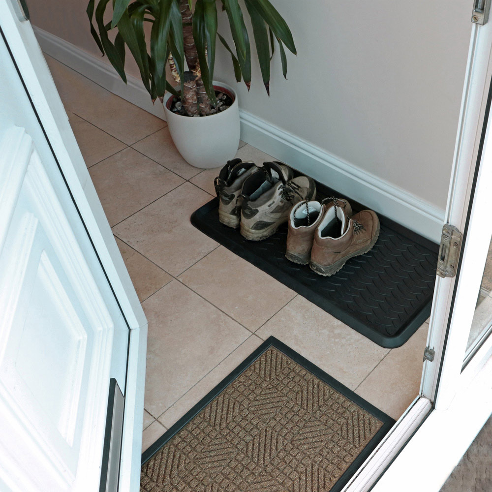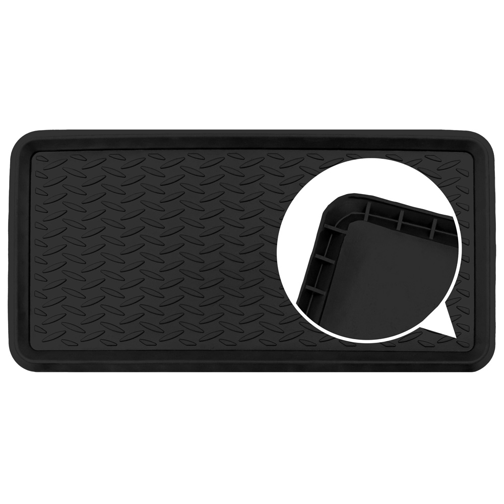 Keep boots and shoes in place while containing any drippings from rain or snow with JVL Opus Rubber Boot Tray Mat. The durable rubber tray with a deep ridge prevents water spillage in single-piece moulded form. This shoe rack can hold up to three adult shoes or boots, collecting dirt and water for a pristine floor. This weather-resistant mat is easy to maintain, requiring only hose or shake cleaning. Ideal for year-round use, suitable for homes, farms, or businesses. This mat keeps a clean and organized space indoors or outdoors, ensuring a tidy and organized environment. Size: 41 x 81cm approximately.