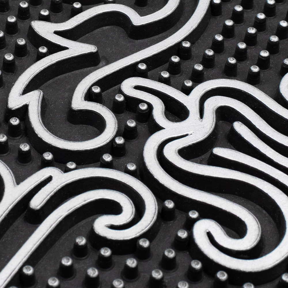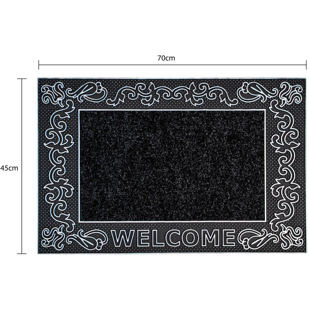 Greet your guests with this Rico Silver Black Scroll Metallic PVC Door Mat 45 x 75cm by JVL. These Rico mats offer the practicality needed to keep the dirt outside. The unique design and metallic finish allow for easy scraping of shoes and are beautifully designed in a PVC mould with a ribbed carpet centre. It is durable and long-lasting, while the ribbed carpet gets deep into the grooves of shoes and boots to remove dirt and soak up moisture, leaving the floor inside the home clean. This mat is easy to clean, shake or hose, making it suitable for indoor use.