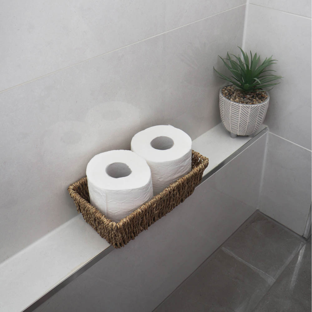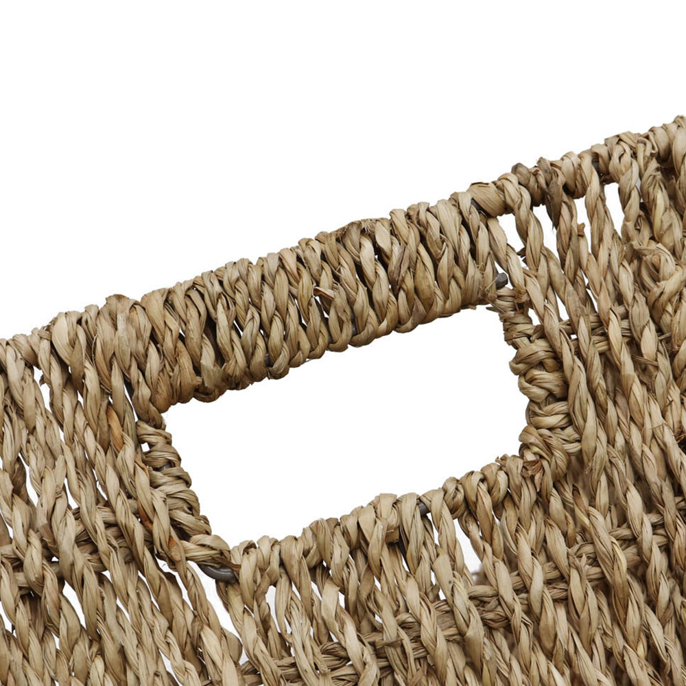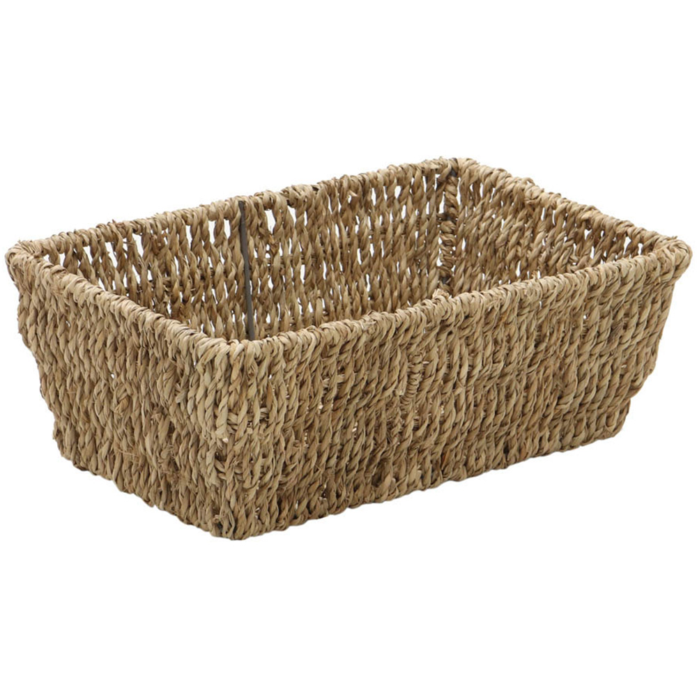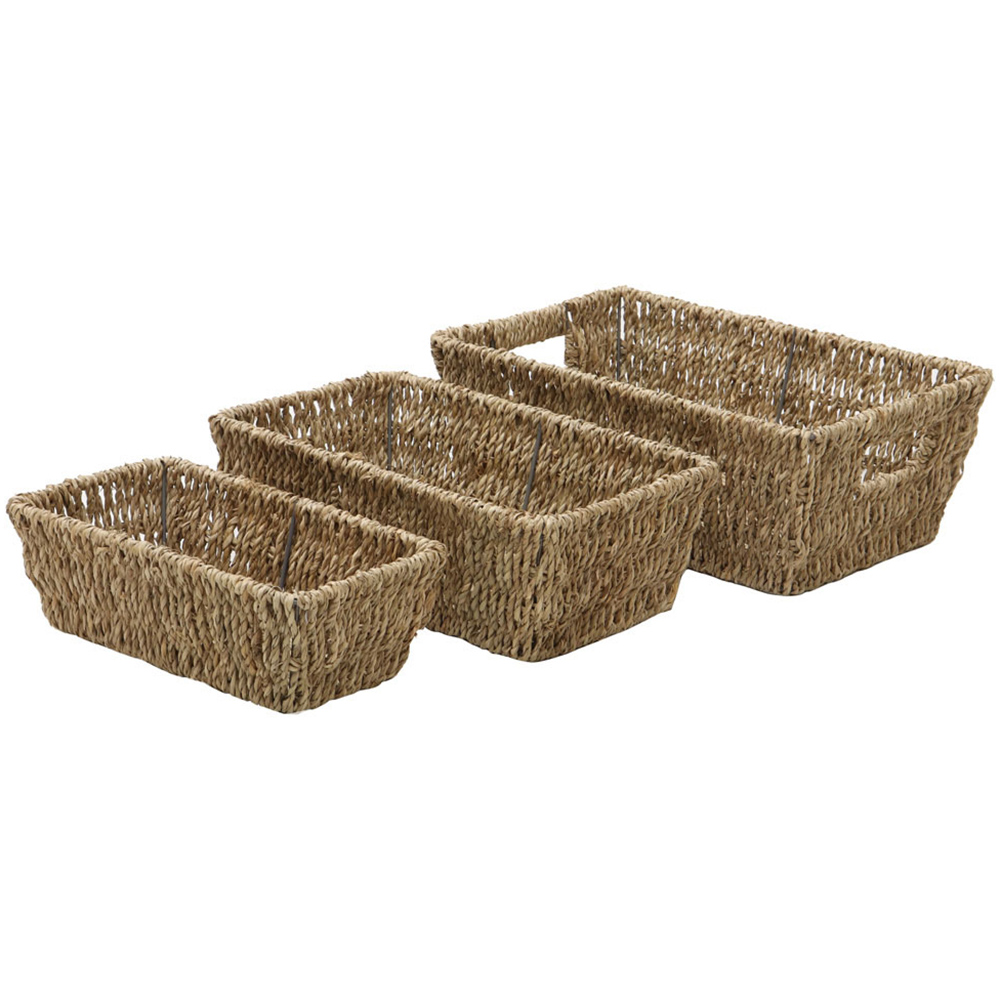 Store your essentials in style with these JVL Seagrass Rectangular Storage Baskets. A must-have accessory for every household, the baskets are woven onto a metal frame for sturdiness and durability. Seagrass is a renewable source, a fast-growing plant that grows in the sea. Also, the material is hand-woven by highly skilled artisans; its neutral tones and strength make it ideal for basket-weaving and complement the home décor. Stylish and practical, these storage baskets are perfect for storing toiletries, makeup, jewellery and more. They are ideal for decluttering your bathroom, bedroom or office space. Easy to use, the storage basket comes with handle holes for easy carrying and moving. Please note: Shades may vary from the images shown as the products are made from natural materials. Set of 3. Capacity: 14L. Size: Large: H13 x W33 x D22cm, Medium: H11 x W29 x D18cm and Small: H9 x W25 x D14cm. Capacity: Large: 8L, Medium: 4.5L and Small: 2.5L.