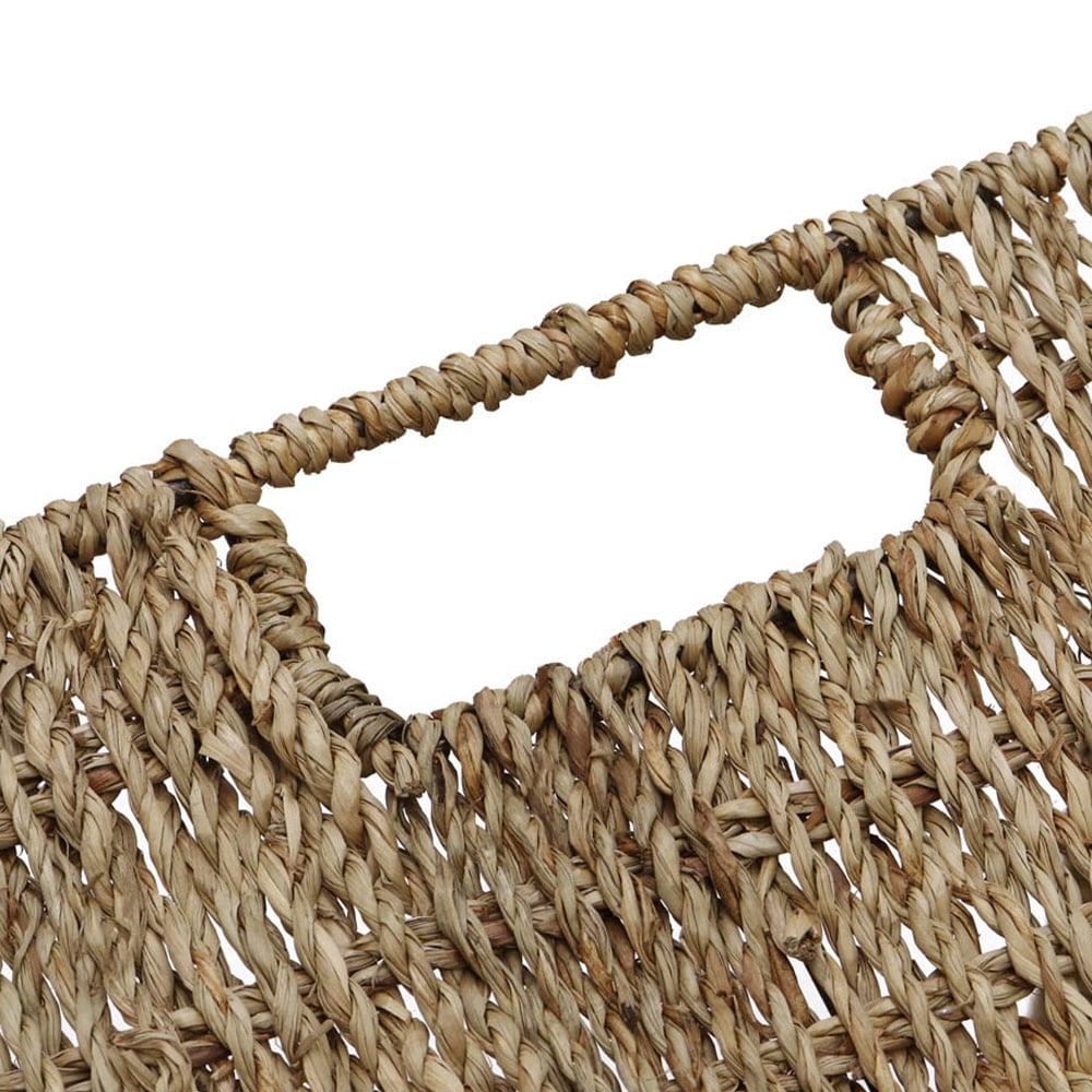 Store your essentials in style with these JVL Seagrass Rectangular Storage Baskets with Handles. A must-have accessory for every household, the baskets are woven onto a metal frame for sturdiness and durability. Seagrass is a renewable source, a fast-growing plant that grows in the sea. Also, the material is hand-woven by highly skilled artisans; its neutral tones and strength make it ideal for basket-weaving and complement the home décor. Stylish and practical, these storage baskets are perfect for storing toiletries, makeup, jewellery and more. They are ideal for decluttering your bathroom, bedroom or office space. Easy to use, the storage basket comes with handle holes for easy carrying and moving. Please note: Shades may vary from the images shown as the products are made from natural materials. Set of 3. Capacity: 14L. Size: Large: H14 x W36 x D23cm, Medium: H13 x W33 x D20cm and Small: H12 x W30 x D17cm. Capacity: Large: 11.5L, Medium: 8.5L and Small: 6L.