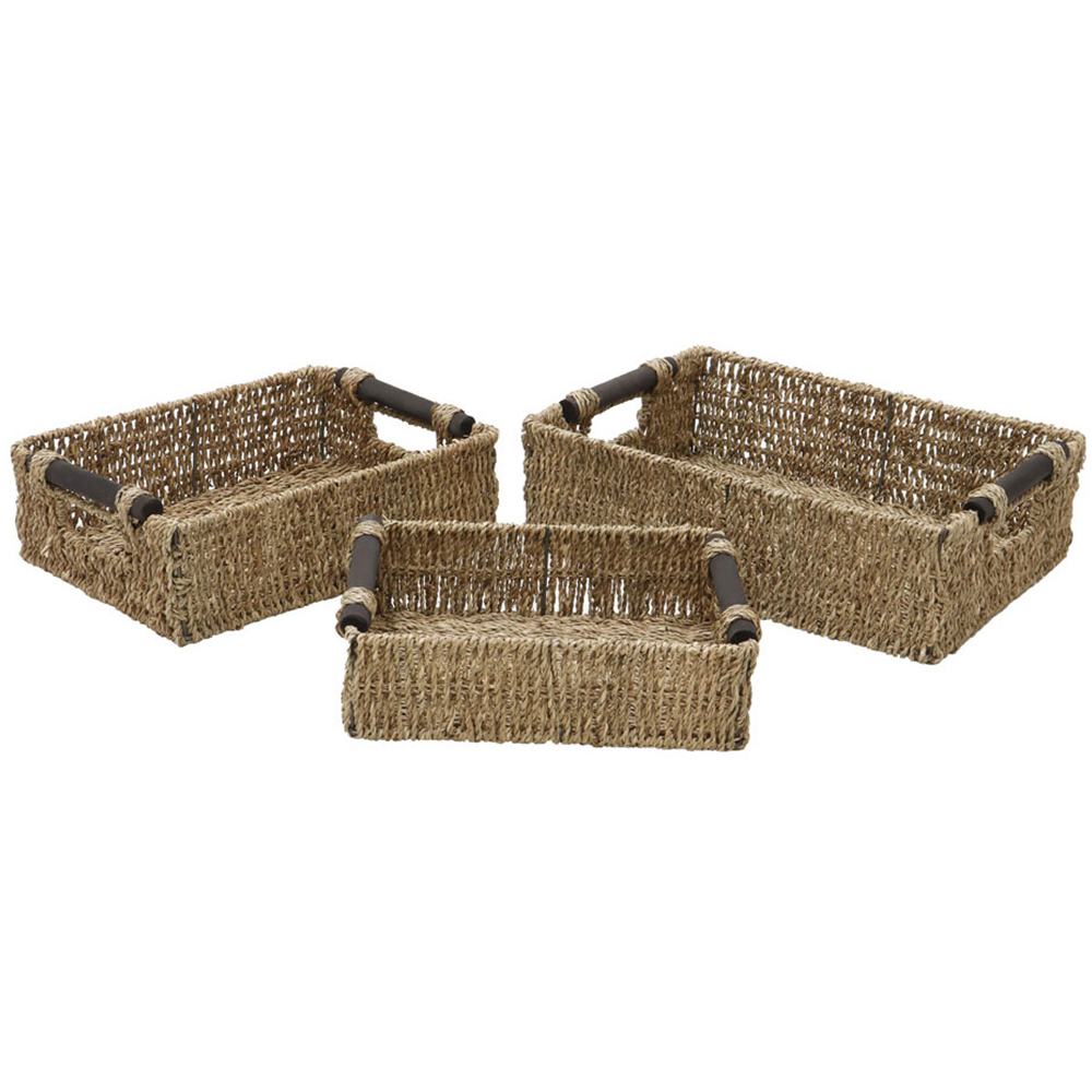 Store your essentials in style with these JVL Seagrass Rectangular Storage Baskets with Wooden Handles. A must-have accessory for every household, the baskets are woven onto a metal frame for sturdiness and durability. Seagrass is a renewable source, a fast-growing plant that grows in the sea. Also, the material is hand-woven by highly skilled artisans; its neutral tones and strength make it ideal for basket-weaving and complement the home décor. Stylish and practical, these storage baskets are perfect for storing toiletries, makeup, jewellery and more. They are ideal for decluttering your bathroom, bedroom or office space. Easy to use, the storage basket comes with wooden handles for easy carrying and moving. Please note: Shades may vary from the images shown as the products are made from natural materials. Set of 3. Capacity: 14L. Size: Large: H11 x W38 x D28cm, Medium: H10 x W33 x D24cm and Small: H8 x W28 x D20cm. Capacity: Large: 11L, Medium: 7L and Small: 4L.