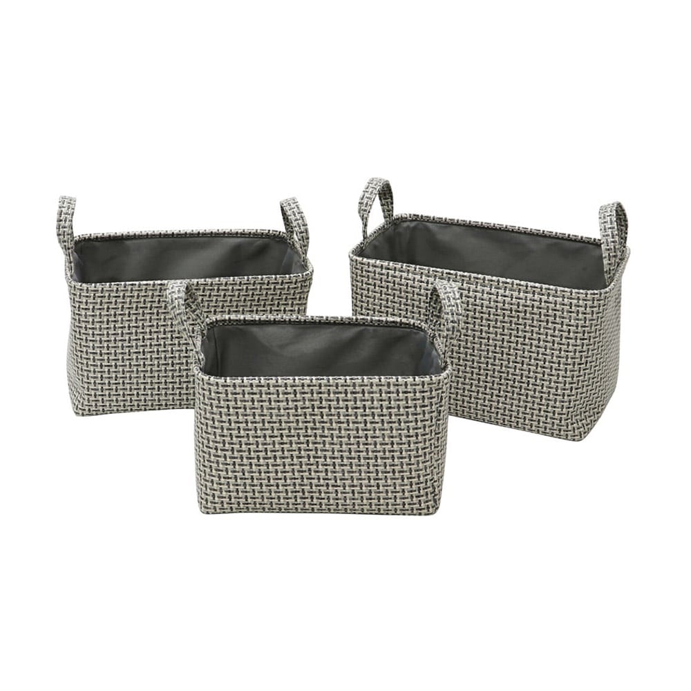 Keep your home tidy and clutter-free with the JVL Silva set of three Rectangular Fabric Storage Baskets. Silva storage collection reflects our woven heritage with a striking basket weave fabric in muted grey tones, creating a dog tooth effect, ideal for any interior decor. These storage baskets are designed to fit with your household decoration. They are versatile and ideal for small garments, jewellery, makeup, toys, towels, linens, baby products and more. You can use them for storing bits and pieces around the home, such as in a bedroom, living room, playroom, utility room or children’s bedrooms. They are attractive open storage baskets suitable for open units and wardrobes and fit inside some drawers for organising clothes. Organise the home and use it to store clothing in your drawer or simply a decorative feature in the home. Each basket features practical handles for ease of moving around. Store inside each other when not in use. Large: H:22x W:38 x D:26cm approx. Capacity: 21.5 approx. Medium: H:20 x W:34 x D:23cm approx. Capacity: 15.5 approx. Small: H:18 x W:30 x D:20cm approx. Capacity: 10.5 approx.