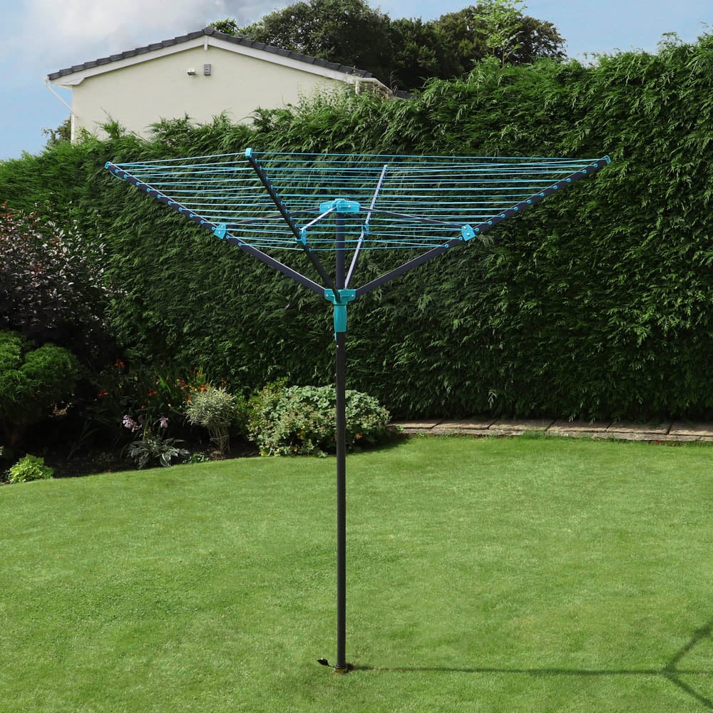 Take the stress out of laundry days and keep your clothes dry with the JVL Slate Grey Rotary Airer. You can conveniently use this four-arm rotary airer and there is no need to put up cumbersome clotheslines for your clothes. This portable airer features four arms and provides 50m of drying space to hang up your laundry. It also features an easy-to-use umbrella locking system that keeps the lines taut and arms in place with a 40kg laundry drying capacity. This airer is made with a steel-frame construction and includes a ground socket for securely fixing into the ground. It is fully collapsable and it can be easily stored away when not in use.