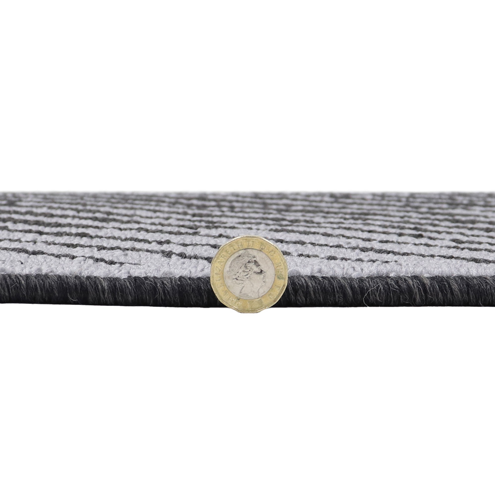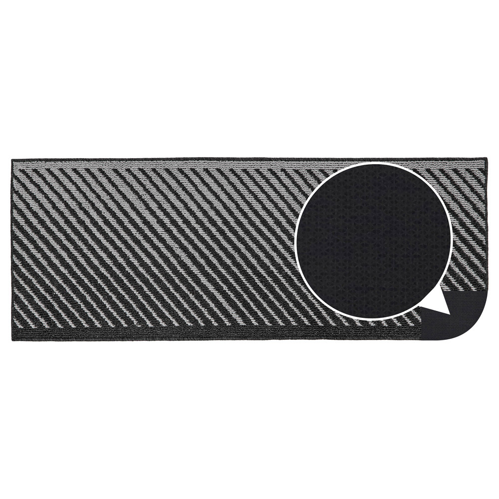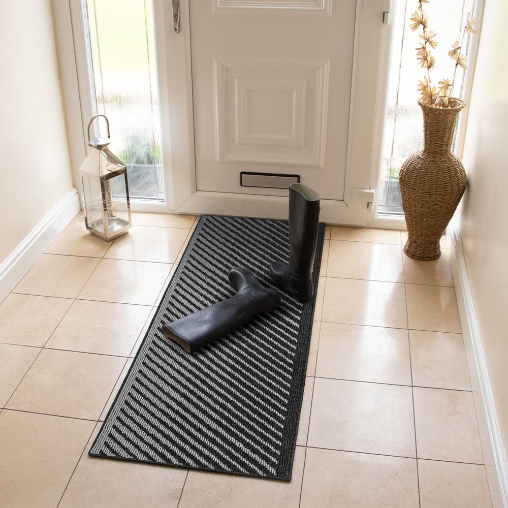 Make a statement in your entrance, hallway, or kitchen with the SJVL Stellar Black Indoor Washable Runner. This runner is designed to prolong the life of your hard floors or carpet while adding a touch of contemporary elegance. The diagonal stripe pattern in two shades of black creates a modern and eye-catching look, perfectly suited for various decor styles. It serves as both a functional and decorative enhancement to any space. Its fibres effectively trap dust and dirt, ensuring cleaner floors for longer. Moreover, they absorb moisture, preventing wet floors and potential slipping hazards. The runner keeps mud and moisture at the door, protecting all types of flooring, whether wood, tiles, or carpet. The latex backing provides stability and reduces movement as you wipe your feet. Cleaning the Stellar runner is a breeze. Simply toss it in the washing machine at 30 degrees Celsius, and it will come out looking fresh and clean, ready to enhance your space once again. It's moisture-absorbing properties and machine washable feature make it a practical choice for indoor use. Size: 57 x 150cm approximately.