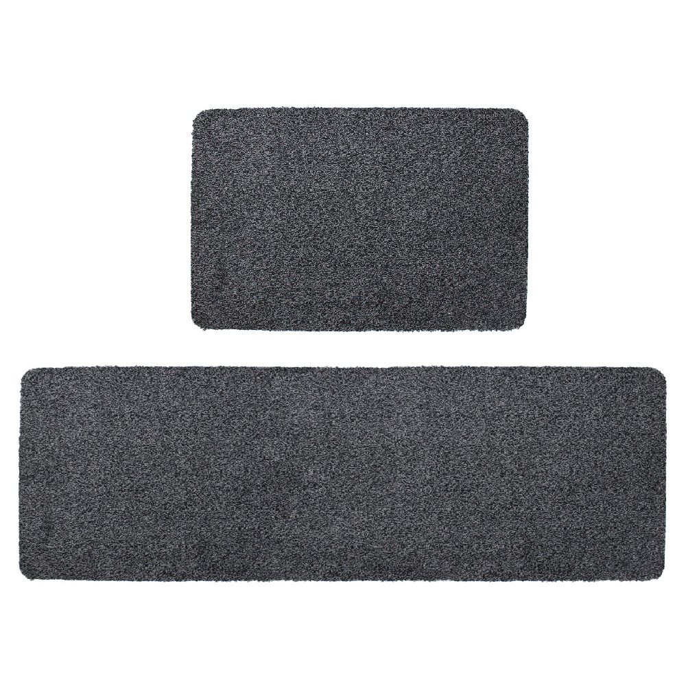 Say goodbye to dirt and moisture that sneaks in with shoes, boots, and paws with the JVL Tanami Charcoal Barrier Doormat and Runner Set, the ultimate solution to keep your home floors clean and dry. This high-quality set creates a barrier from the outdoors and prevents dirt from getting in. Perfect for any entrance, kitchen, hallway, or any area of your home that requires extra protection. With its deep pile design, the set removes excess dirt and moisture from soles, boots, and paws, while the fibres soak up moisture to keep floors dry. The latex backing ensures that the mat stays in place while wiping your feet. Plus, the two-tone fleck design hides dirt and keeps the product looking cleaner for longer. And when it starts to look dirty, simply toss it in the washing machine at 30°C for hassle-free cleaning. Invest in the set to keep your floors spotless and your home looking its best. Set of two. Size: Mat: 50 x 75cm. Runner: 50 x 150cm.