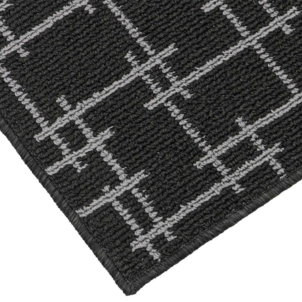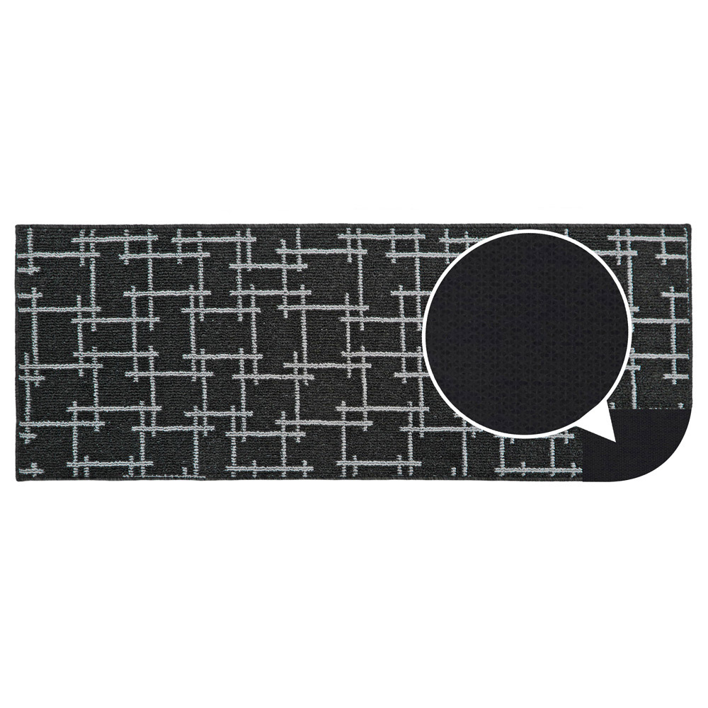 Enhance the aesthetic appeal and functionality of your entrance, hallway, or kitchen with the JVL Vector Black Indoor Washable Runner. This runner is designed to prolong the life of your hard floors or carpet while adding a touch of contemporary style. The criss-cross pattern in two shades of black creates a visually appealing design that suits various decor styles. It serves as both a functional and decorative enhancement to any space. Its fibres effectively trap dust and dirt, ensuring cleaner floors for longer. Moreover, they absorb moisture, preventing wet floors and potential slipping hazards. The runner keeps mud and moisture at the door, protecting all types of flooring, whether wood, tiles, or carpet. The latex backing provides stability and reduces movement as you wipe your feet. Cleaning the Vector runner is effortless. Simply toss it in the washing machine at 30 degrees Celsius, and it will emerge looking fresh and clean, ready to enhance your space once again. Its moisture-absorbing properties and machine-washable nature make it a practical choice for indoor use. Size: 57 x 150cm approximately.