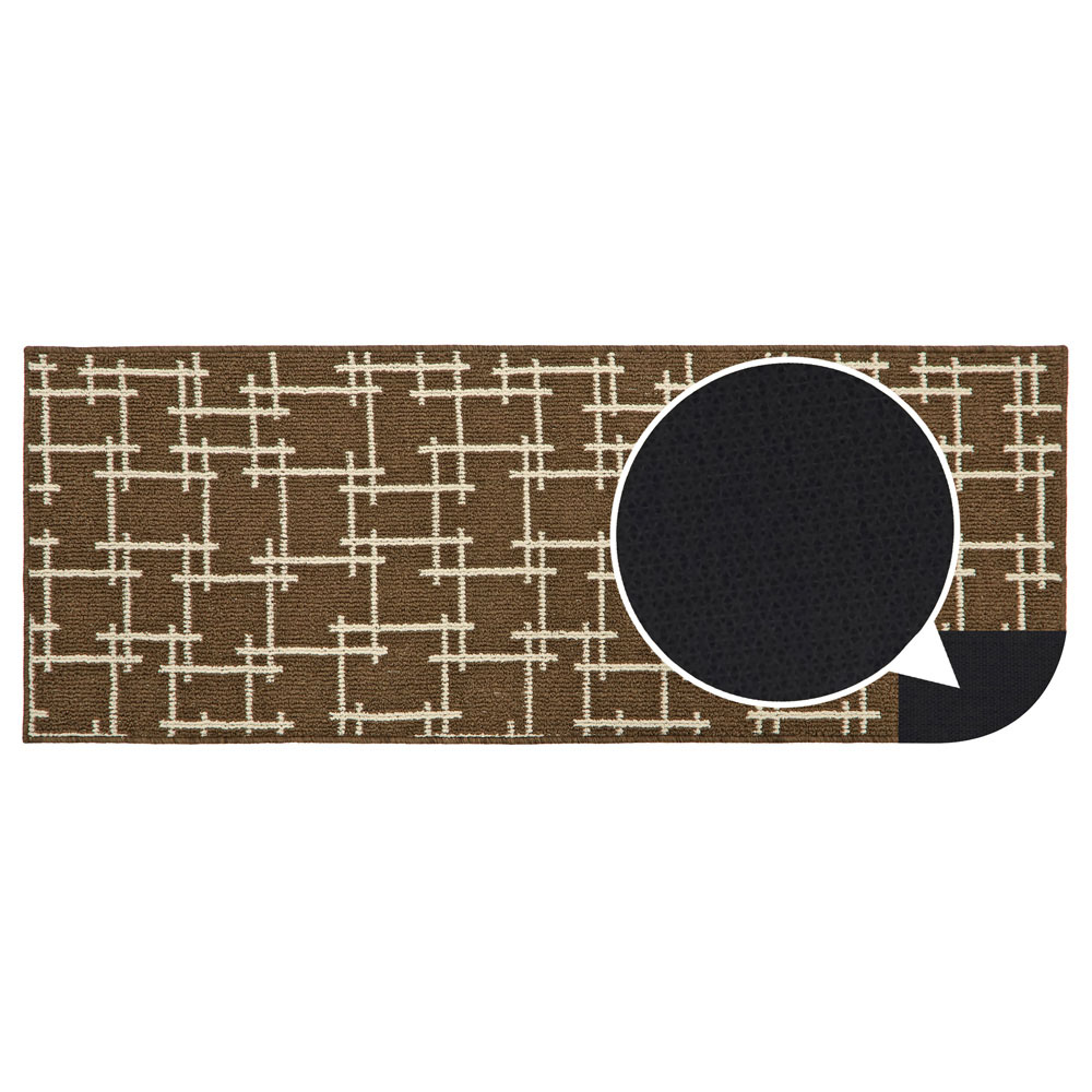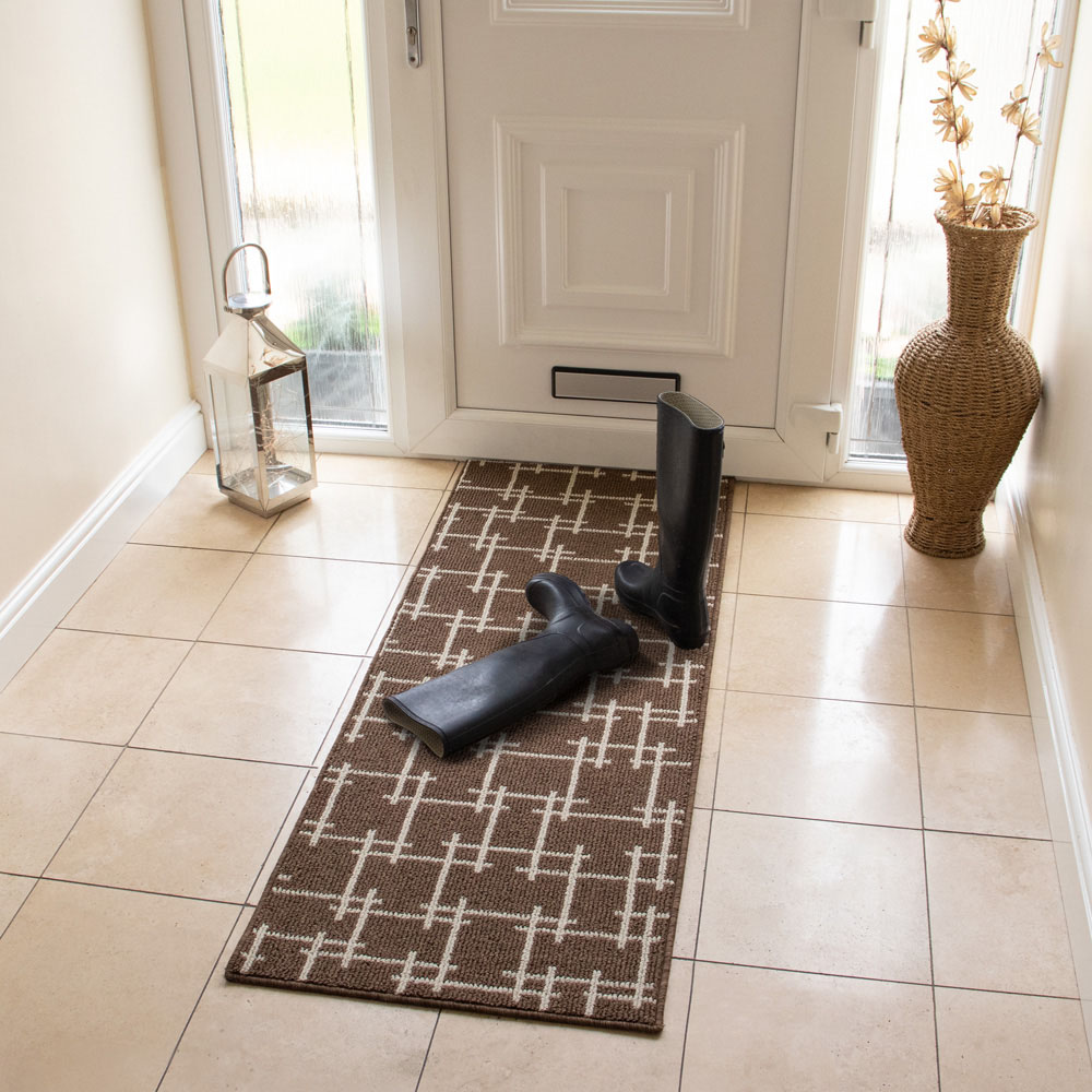Enhance the aesthetic appeal and functionality of your entrance, hallway, or kitchen with the JVL Vector Brown Indoor Washable Runner. This runner is designed to prolong the life of your hard floors or carpet while adding a touch of contemporary style. The criss-cross pattern in two shades of brown creates a visually appealing design that suits various decor styles. It serves as both a functional and decorative enhancement to any space. Its fibres effectively trap dust and dirt, ensuring cleaner floors for longer. Moreover, they absorb moisture, preventing wet floors and potential slipping hazards. The runner keeps mud and moisture at the door, protecting all types of flooring, whether wood, tiles, or carpet. The latex backing provides stability and reduces movement as you wipe your feet. Cleaning the Vector runner is effortless. Simply toss it in the washing machine at 30 degrees Celsius, and it will emerge looking fresh and clean, ready to enhance your space once again. Its moisture-absorbing properties and machine-washable nature make it a practical choice for indoor use. Size: 57 x 150cm approximately.