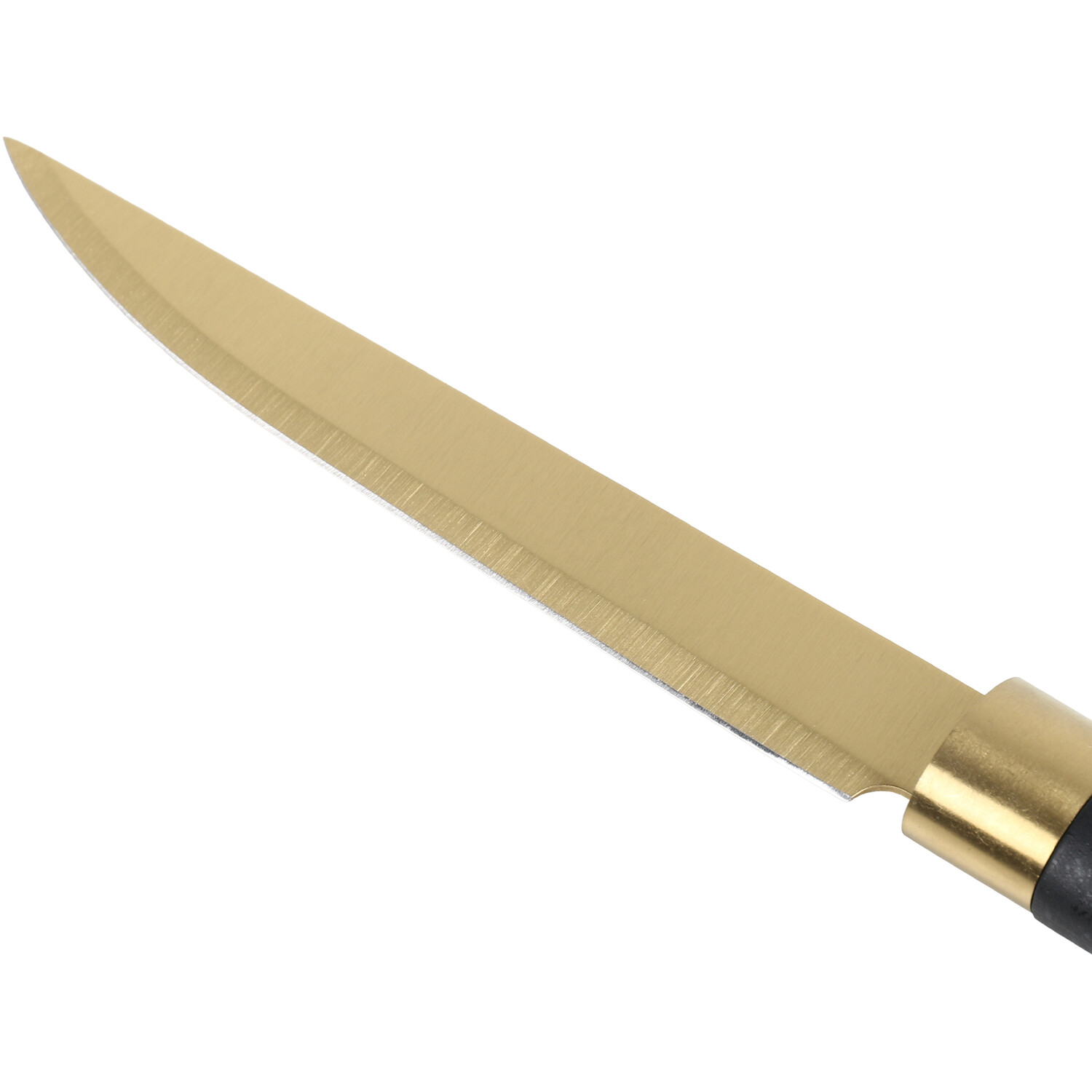 The Kaiseki Utility Knife is a sleek and sophisticated utensil for any kitchen. The knife has a black handle and a gold-toned, non-stick blade to prevent food from sticking. It's ideal for everyday chopping tasks and can easily handle vegetables, meat, and fruit, making it a must for keen cooks and novices.