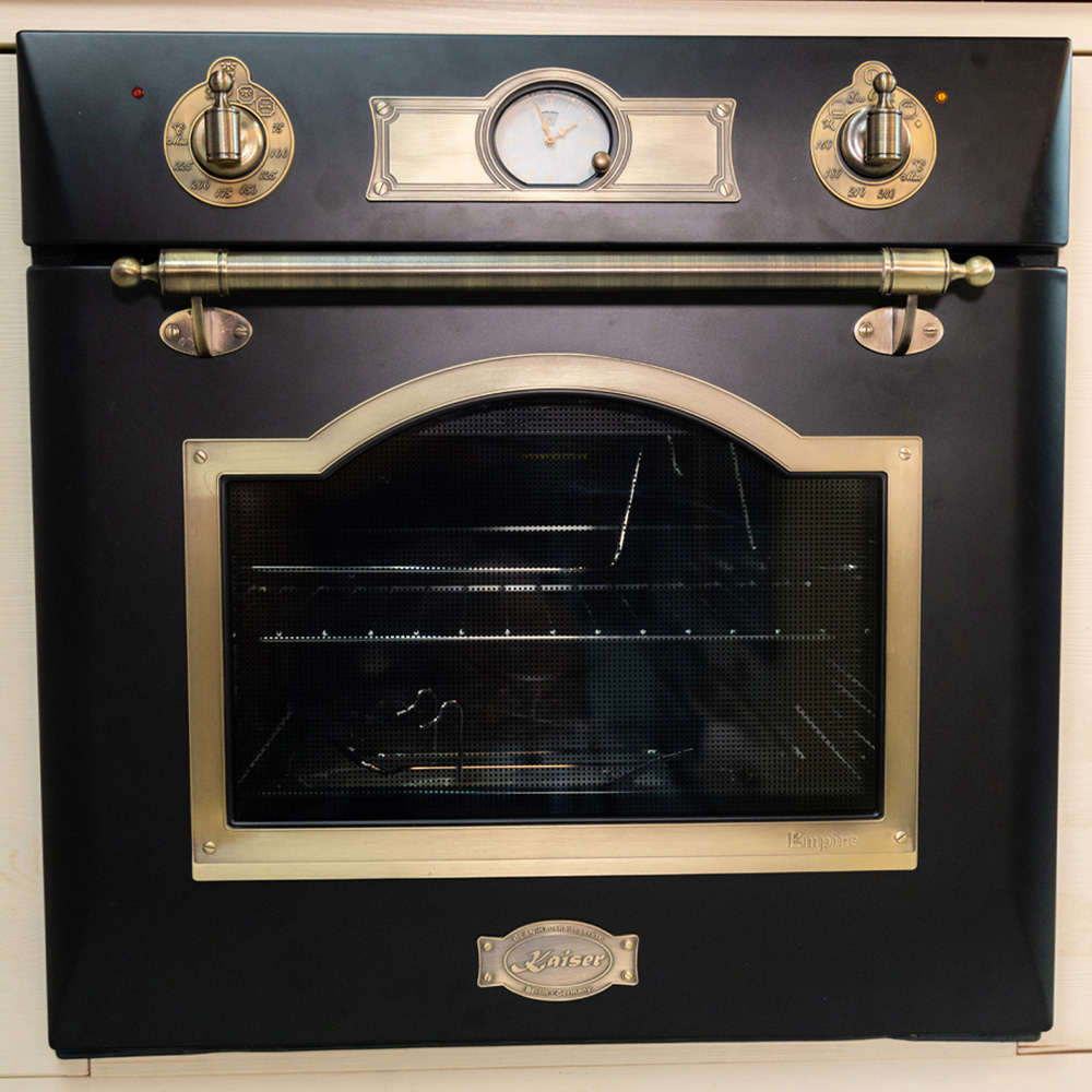 This 60cm built-in gas oven in classic black brings vintage charm to your kitchen with bronze accents and an enamel finish that’s easy to wipe clean. The sturdy metal knobs offer one-handed ignition, and the main oven is paired with an electric rotisserie and infrared grill to cook everything from roast chicken to crispy fish. With a large 67L capacity and built-in timer, it’s practical, stylish, and built to last.