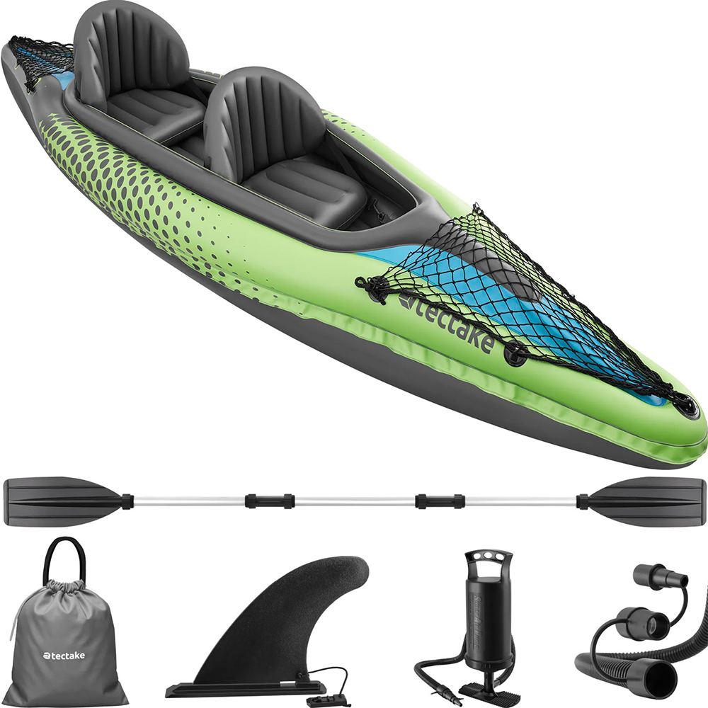 The two-person inflatable kayak Liberty by tectake offers you the perfect blend of stability, durability, and comfort ideal for memorable days of kayaking on lakes or rivers. Made from high-quality PVC material, the Liberty kayak set ensures excellent shape retention and exceptionally good load capacity. With the two sturdy double paddles made of aluminium, the canoe glides effortlessly through the water, while the two attachable fins provide outstanding manoeuvrability. The kayak's two removable seats with high backrests are extremely comfortable to sit on, ensuring optimal comfort even on longer touring journeys or fishing trips. The two transport nets also provide ample space for luggage, equipment and accessories, so you have everything you need when you're out for a paddle. With the double-action pump, the boat is ready to go in no time, and the three high-quality Boston valves ensure that no air can escape from the kayak, maintaining buoyancy. The set also includes a robust carrying bag to use for convenient transport and storage.