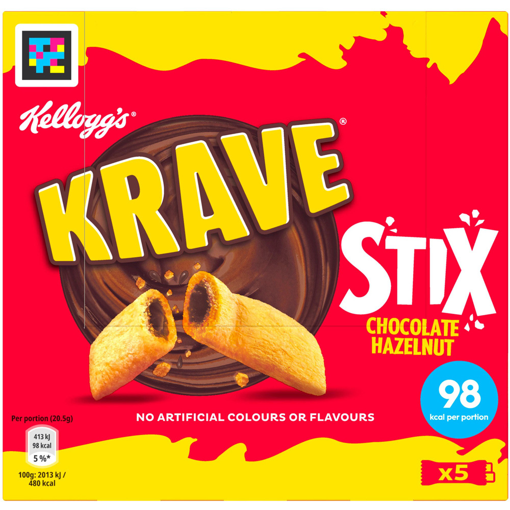 Kellogg's Krave Stix. 98 Kcal Per Portion. No Artificial Colours Or Flavours. Suitable For Vegetarians. Kellogg's.
