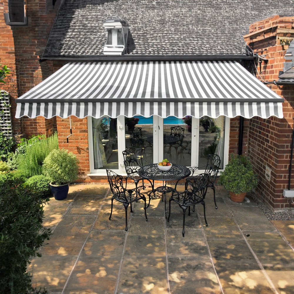 The Greenhurst Easy Fit Awning has a high quality 300gm polyester fabric. They are ideal to extend the home into the garden by providing simple yet effective cover from sun or showers. Ideal for patio and decking areas. Simple to use, they winch in and out effortlessly. Easy to install with simple to follow instructions. The awning can easily be removed from the brackets for winter storage. In an attractive Grey and White stripe design. 3.5m x 2.5m x 15cm