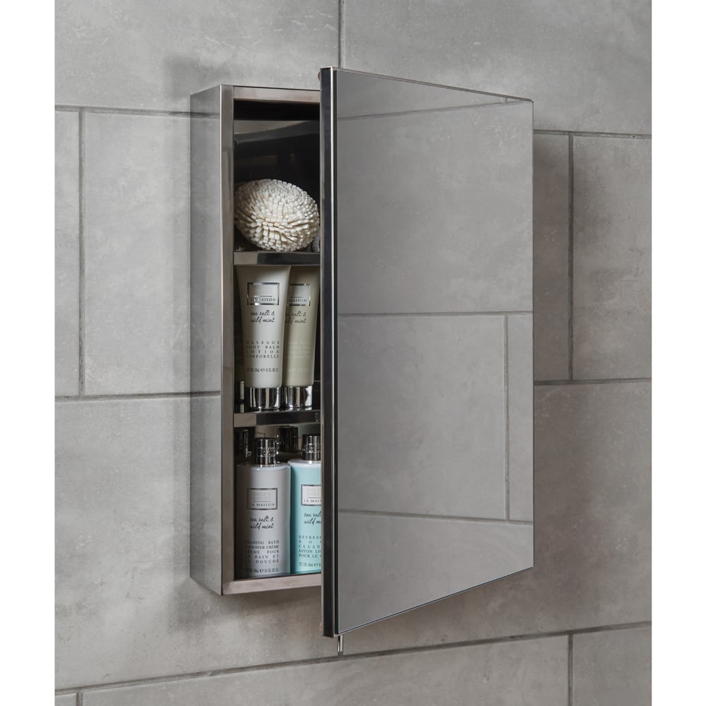 One large mirror door opens to reveal a spacious shelving area, perfect for storing toiletries and other bathroom items. In addition, the mirror will allow you to easily view yourself as you apply makeup, shave your face or brush your teeth, whether in your bathroom or bedroom.