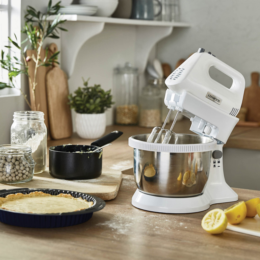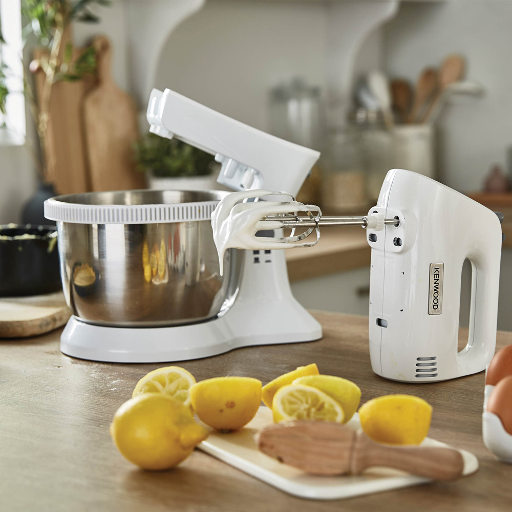 Prepare your favourite recipe with the Kenwood HMP34.A0W Chefette Lite 3L Hand Mixer with Rotating Bowl. It will be your trusted companion while you whisk or knead to create the most delicious recipe. It features a 450W motor that makes mixing easy with a 3L bowl for large quantities. The five speed settings make the task of folding, mixing and whisking easy for your food preparation. It includes stainless-steel beaters, kneaders, metal whisk and metal dough hooks. It can be used as a handheld mixer or you can use the stand for added convenience.