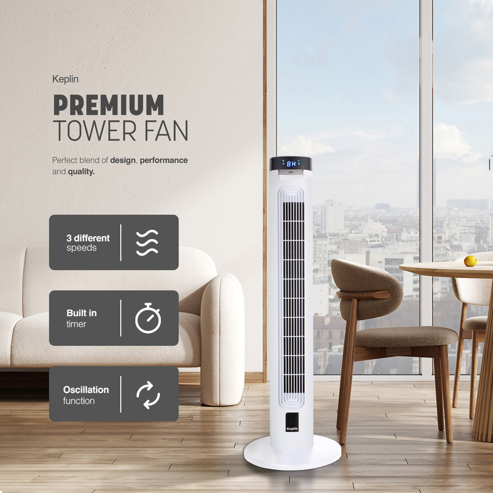 Keplin's Tower Fan is plug-and-play with top-mounted controls, versatile speeds, modes, and an energy-efficient timer. Control it conveniently with a remote or touch panel for efficient and quiet operation day and night.