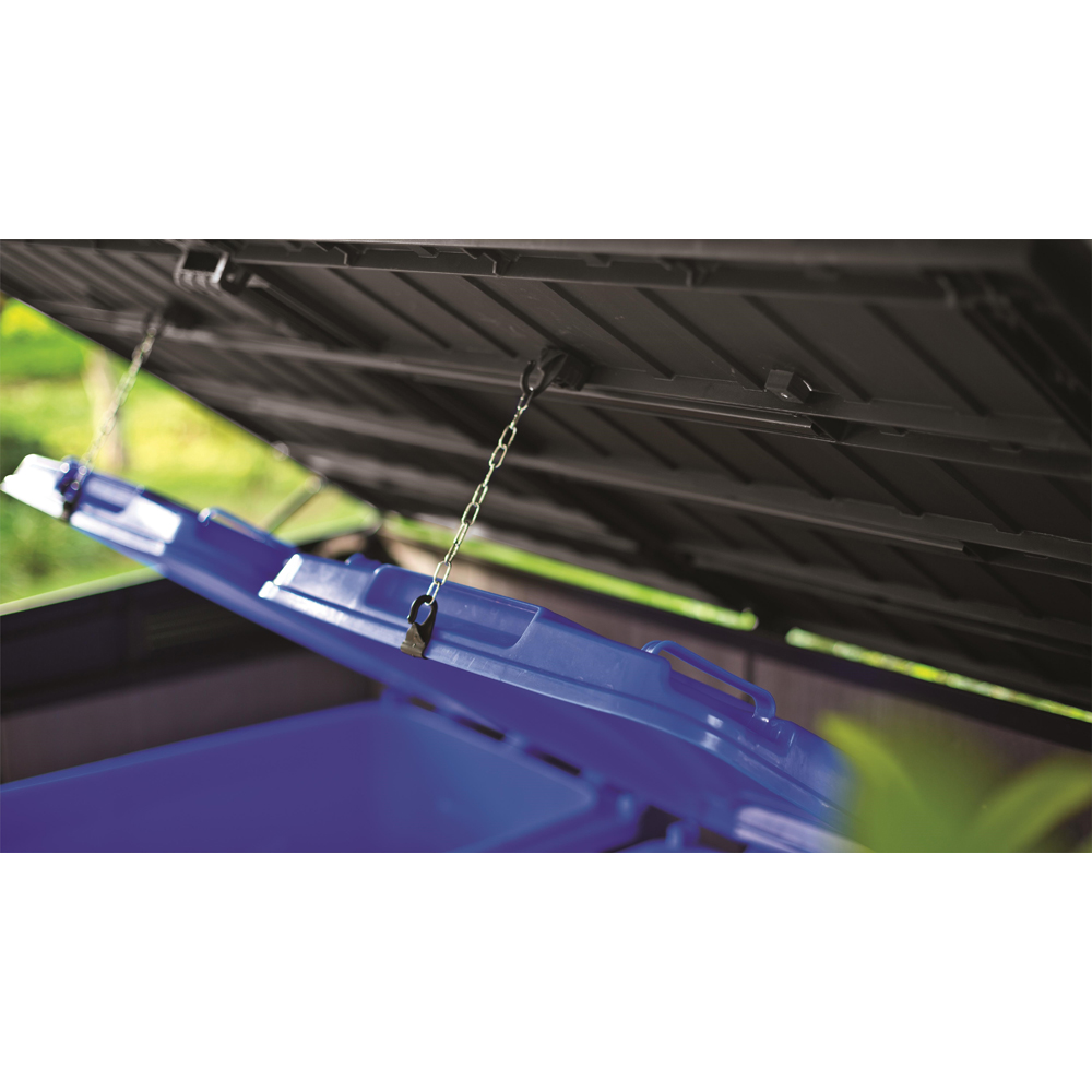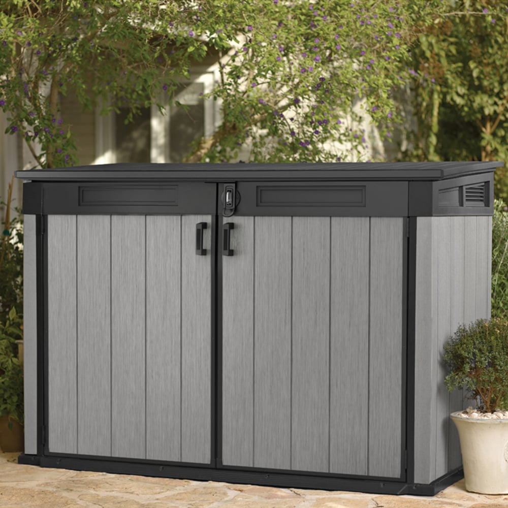 Declutter your outdoor space in style with this Keter 2020L Grande Store Grey Outdoor Storage Shed. Sturdy, spacious, and elegant, the shed is built with ultra-rugged duotech walls to withstand any weather conditions. The walls are also paintable, so you can customize the unit to be uniquely yours. It offers the perfect storage solution for three 240L wheelie bins or garden furniture cushions, barbecues, garden equipment and accessories. Made with convenience in mind, this outdoor shed has a one-hand opening handle, hydraulic pistons on the lid and a sloped threshold for easy access for those heavier items. Also included are adjustable brackets for one shelf to help provide the opportunity to tailor the storage unit to suit your needs. As an extra safety feature, it comes with a lockable feature for added peace of mind and built-in ventilation. Easy installation with pre-cut tongue and groove panels.