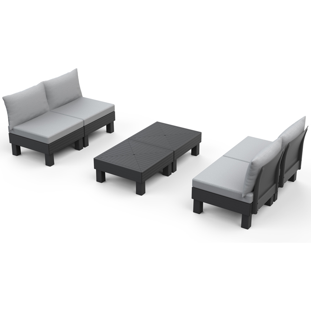 Make a comfortable addition to your living space with this Keter Elements 4 Seater Grey Lounge Set with Cushions. This set is the perfect way to elevate your outdoor space. It has a textured finish resembling real wood, adding a natural aesthetic to your garden. It features two two-seater sofas and a table. The Element's smart modular and expandable design allows you to customise the set's configuration to suit your garden space and is excellent for hosting and entertaining. It is secured by metal connectors that prevent the components from shifting around. The cushions included feature anti-slip dots on the bottom to prevent slipping and are nine cm thick to provide optimal seating comfort to relax and unwind. The set is weather-resistant, UV-protected, and durable enough to withstand various weather conditions. It is easy to clean and maintains its elegant appearance. Protect your garden furniture with our durable and waterproof covers. Explore our wide range of heavy-duty Garden Furniture covers to find the perfect fit for your needs.