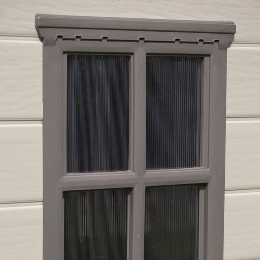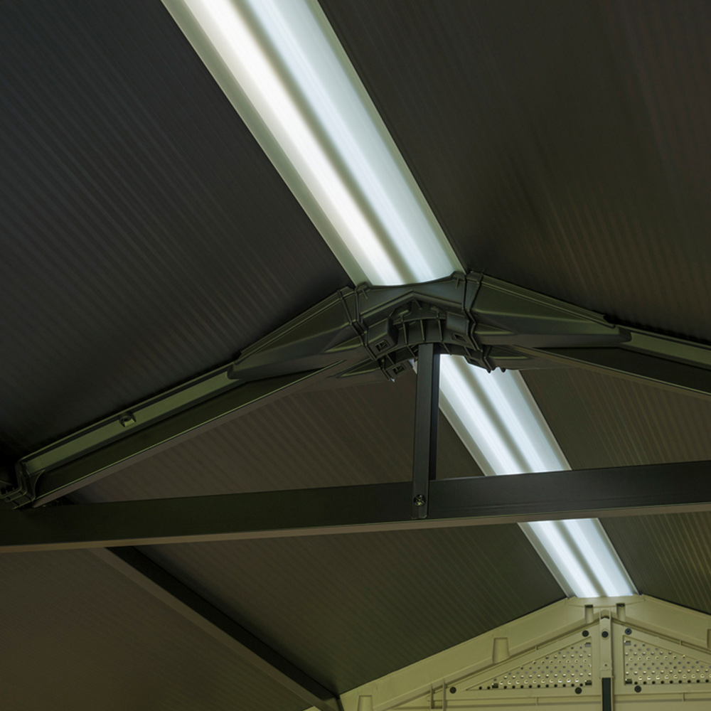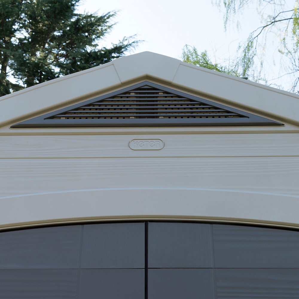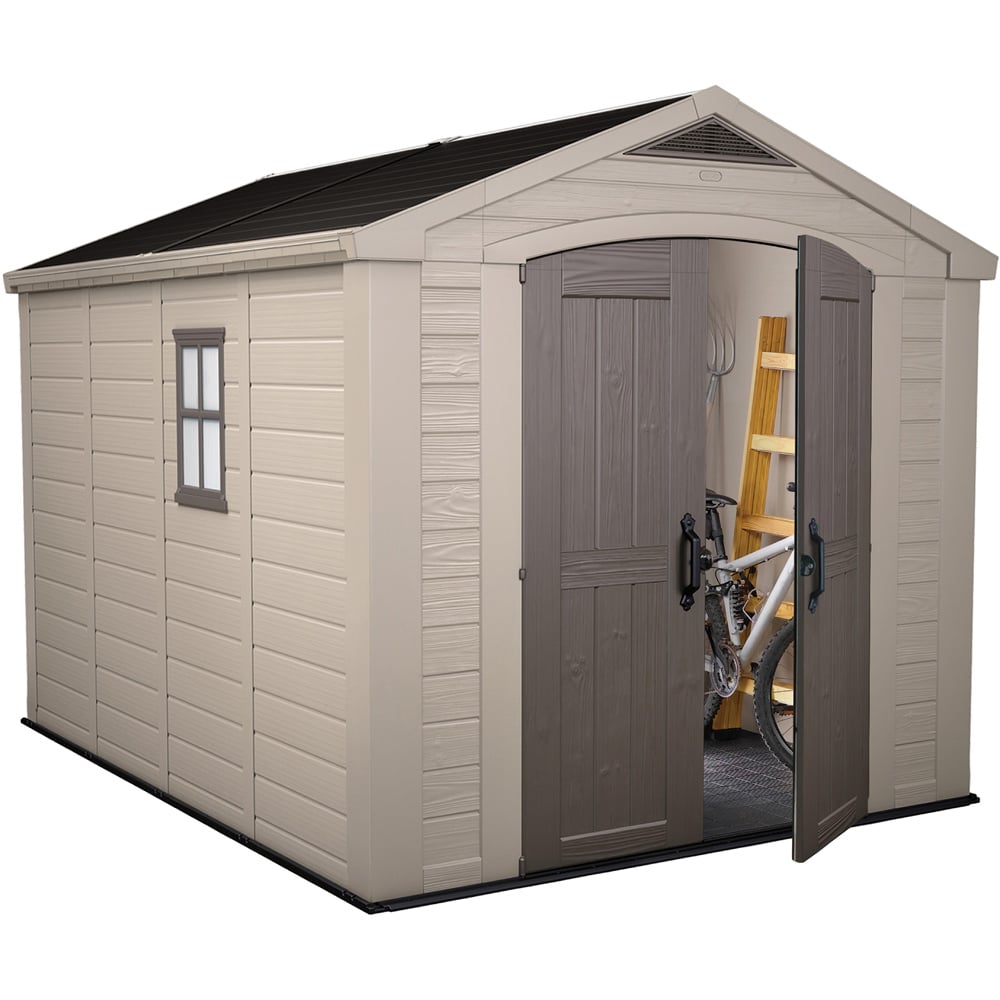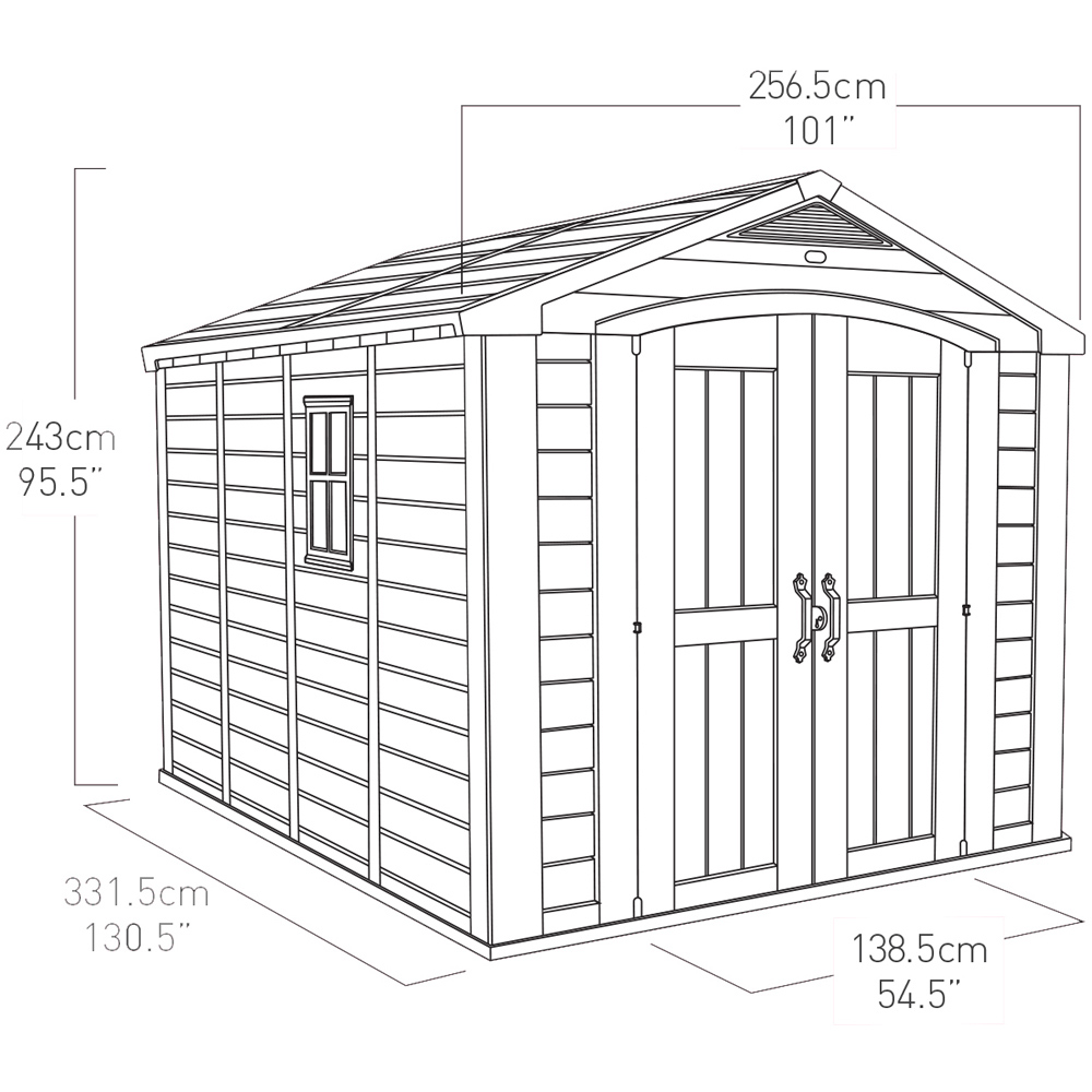 This elegant outdoor garden shed makes storing just about anything simple and elegant. The Keter Factor 8 x 11ft large apex resin shed is made of a durable and weather-resistant resin that has a fine wood-like texture for looks and incorporates steel reinforcement for sturdiness. The shed offers an ideal outdoor storage solution for all garden tools and equipment, garden furniture including BBQs, bicycles and DIY tools. This shed is ventilated and comes with a window and skylight to allow plenty of natural light. The shed has a heavy-duty floor that is ideal for storing heavy items such as lawnmowers and ATVs, a high ceiling that lets you move around with ease, and wide double doors, making it easy to enter and access everything you need. This shed is lockable, includes two shelves and is easy to assemble. The assembled external dimensions are H243 x W256.6 x L331.5cm, and the internal dimensions are H238.5 x W236.5 x L311.5cm.